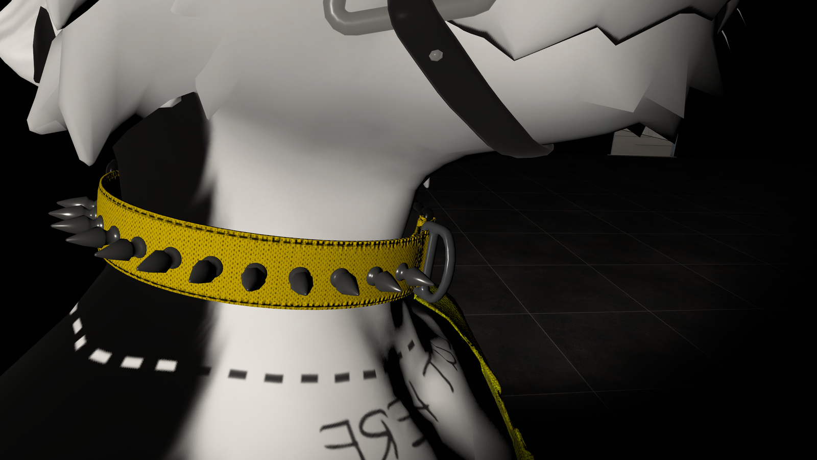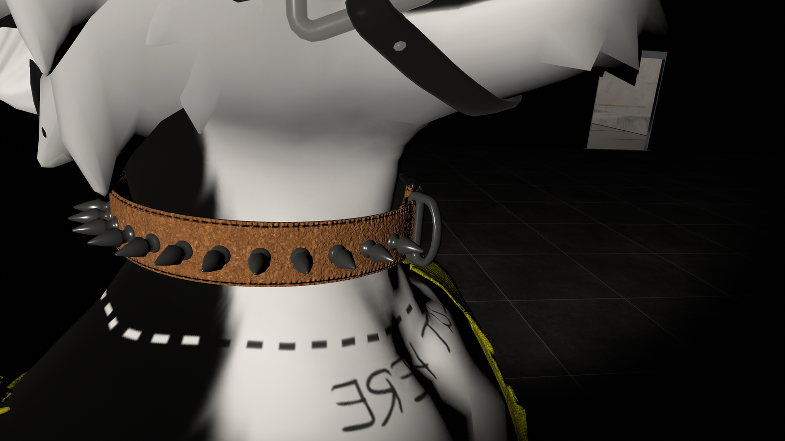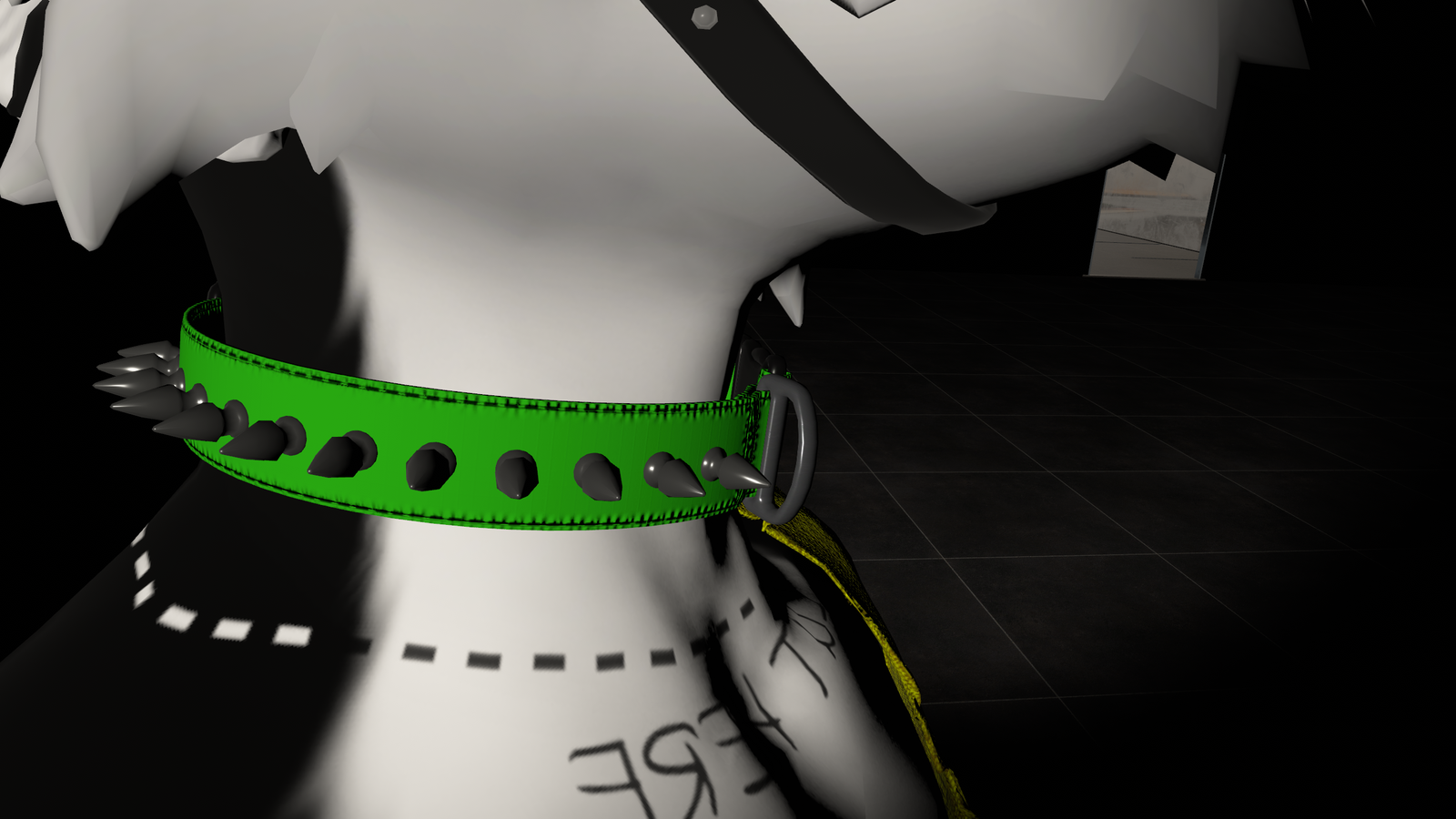 This is a spiked collar made currently for the Winterpaw Masc Canine. Minor modifications using VRCFury should allow it to work on any avatar that has a neck. Could also just be used as a static object in world. Provided video shows current customization toggles.