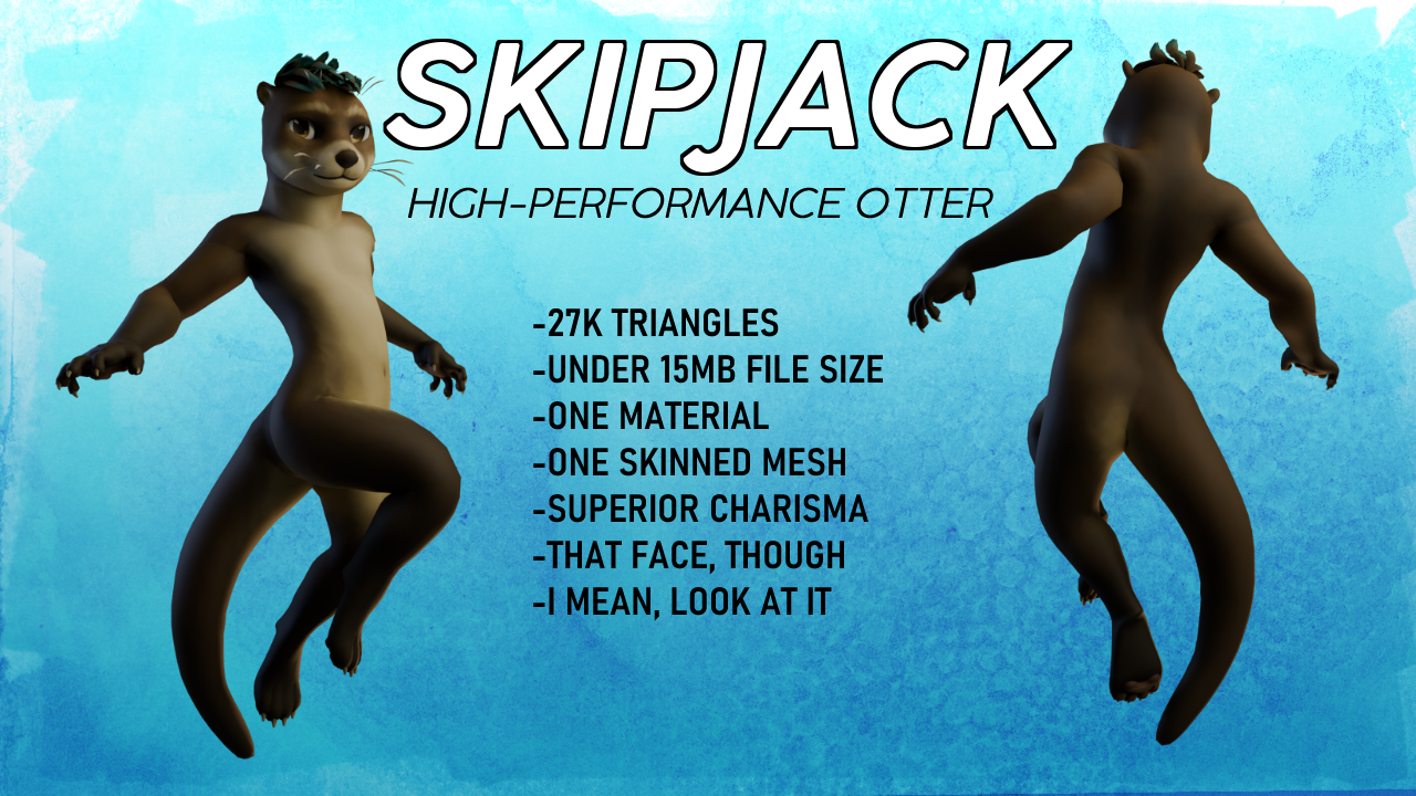 Skipjack is a high-performance, very lightweight Avatar 3.0 otter ideal for clubgoers and fun-seekers. He's my first commercial avatar, and I'm sure you'll get along great!