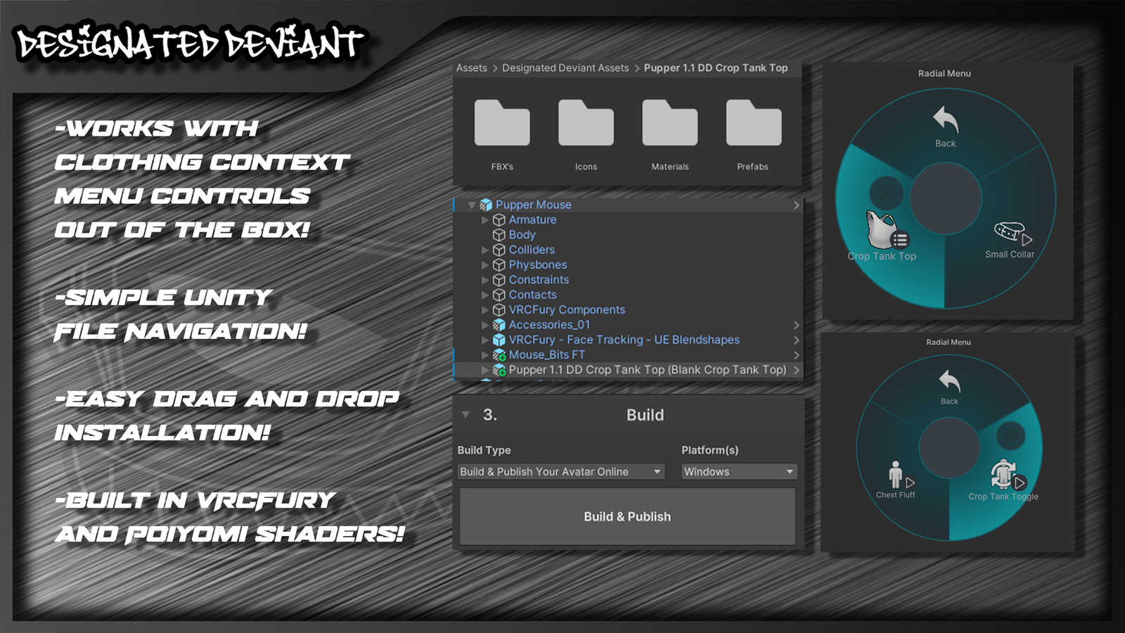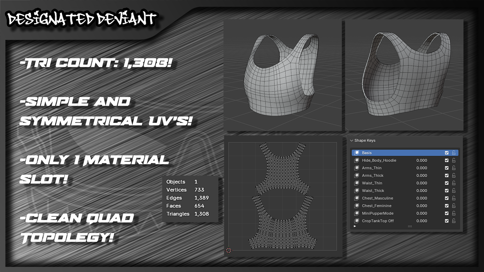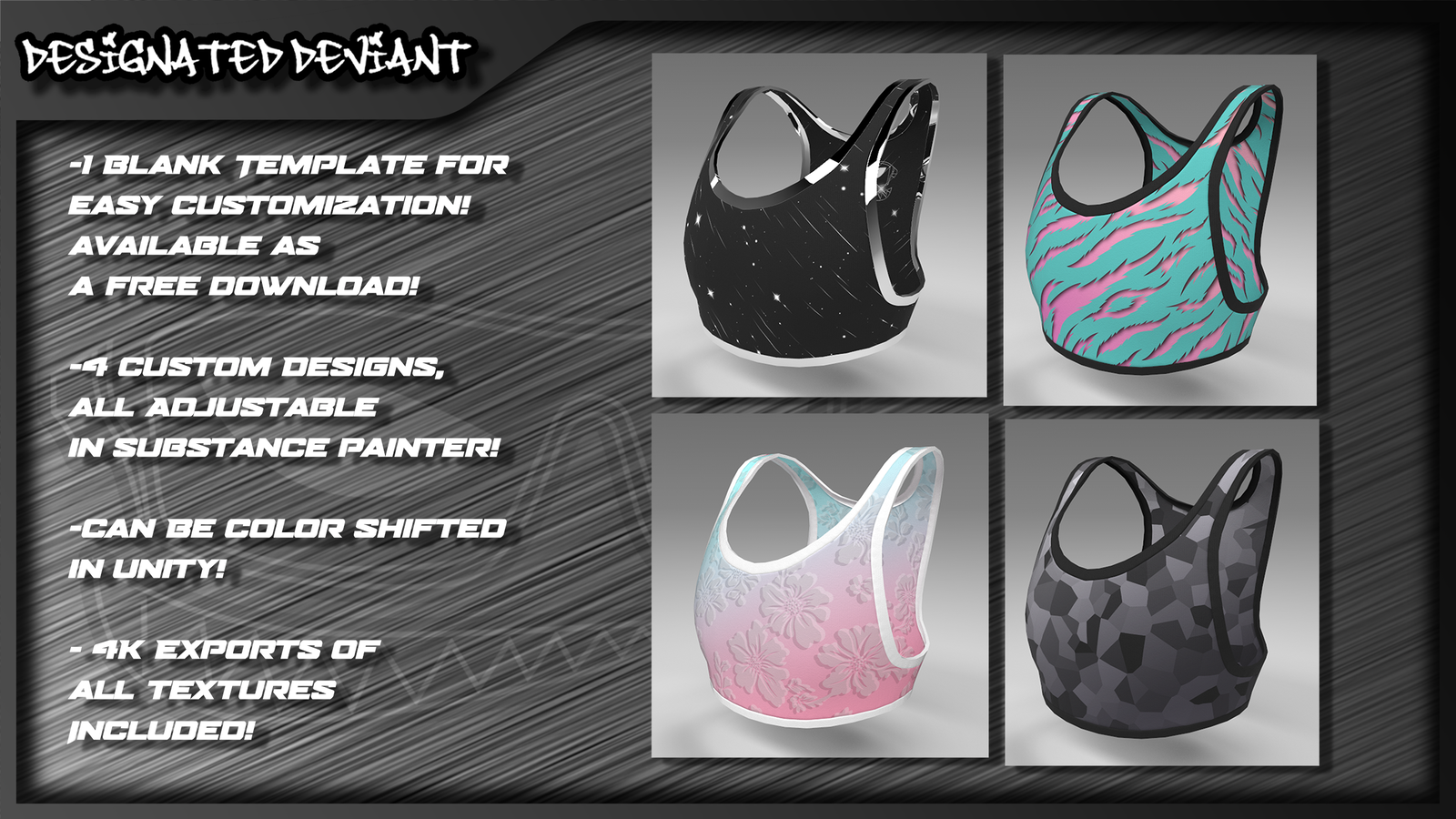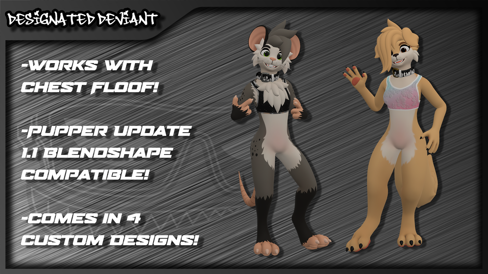 - Compatible with other Designated Deviant clothing assets!
