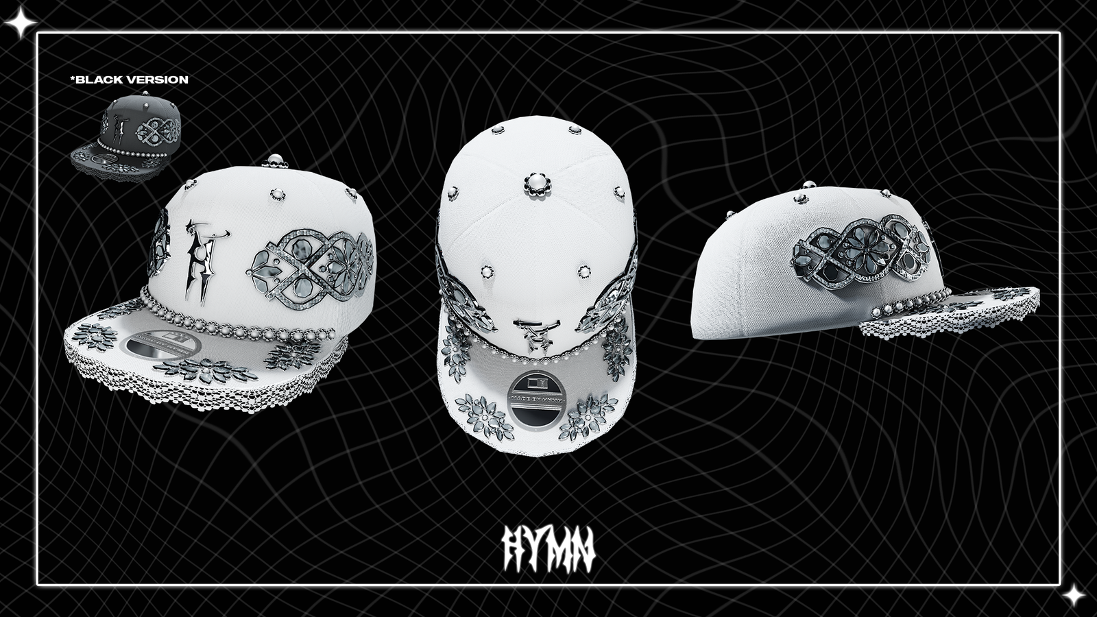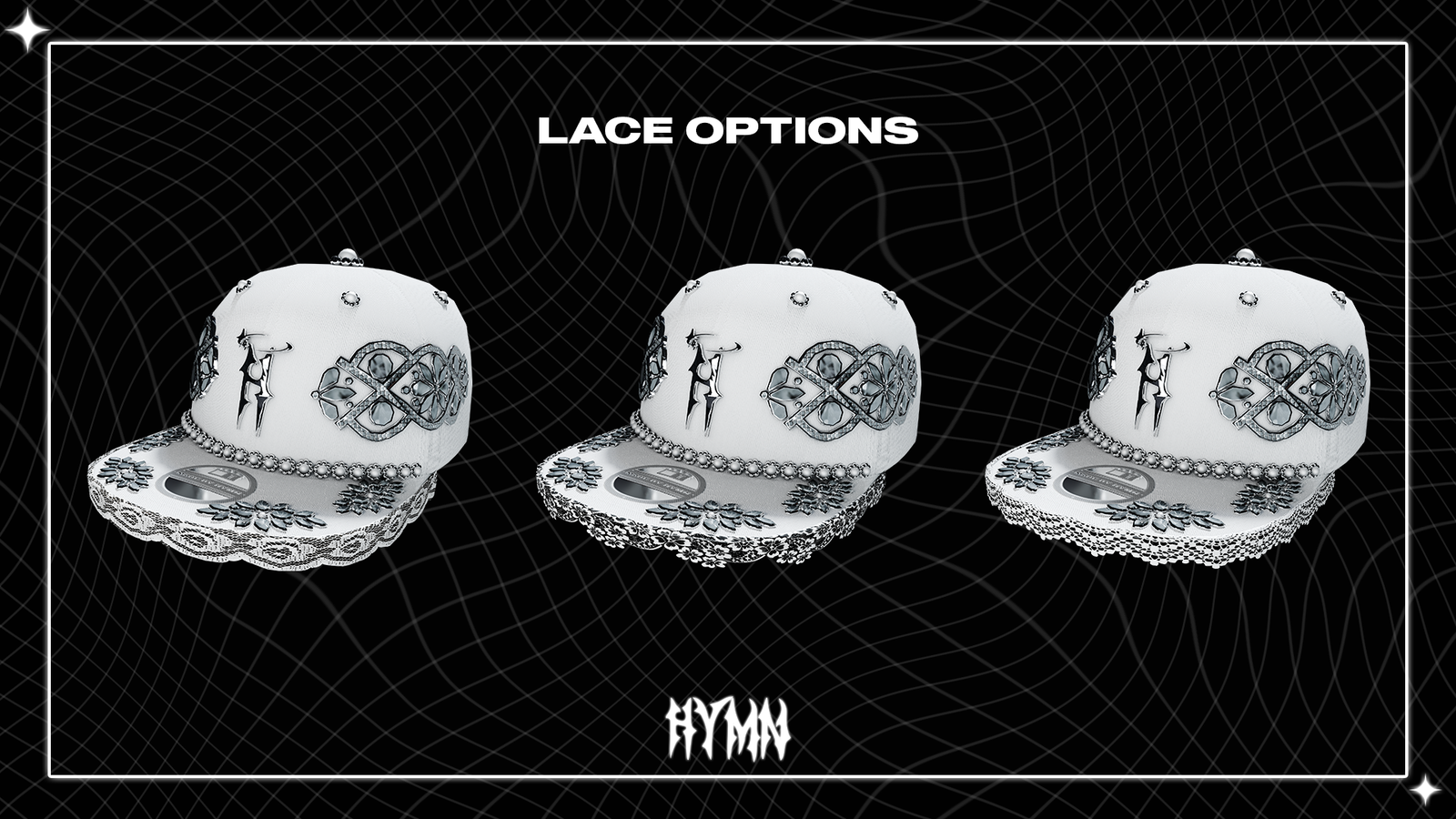 - 4 Materials (Hat, Metal, Lace, Rhinestones)