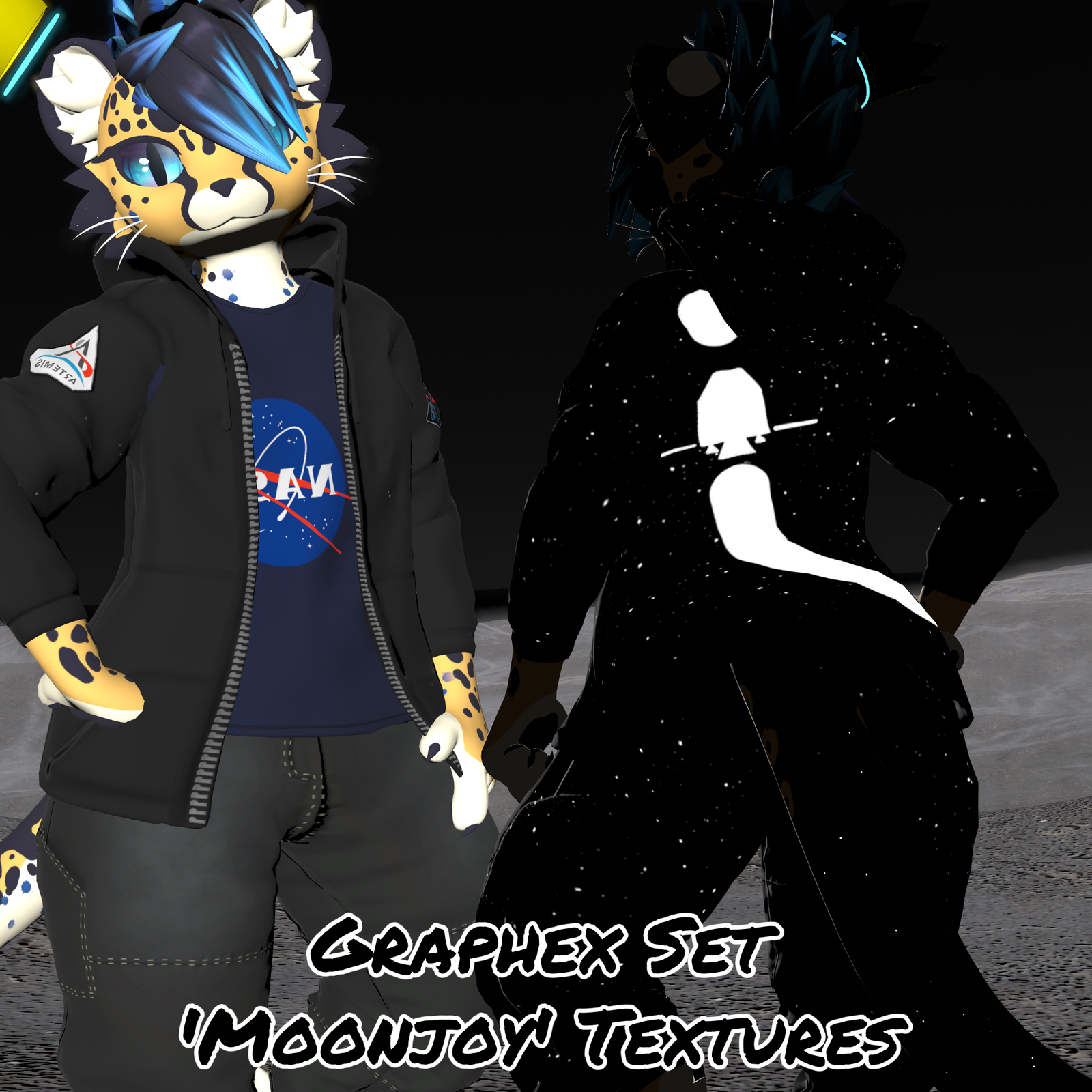 On the surface this retexture for my Graphex Set (https://jinxxy.com/Inkblitz/graphex) is pretty plain. Black hoodie with gray pants, with a simple NASA blob t-shirt. But in darkness, the stars light up across the entire set and the Orion capsule appears on its way towards the moon.