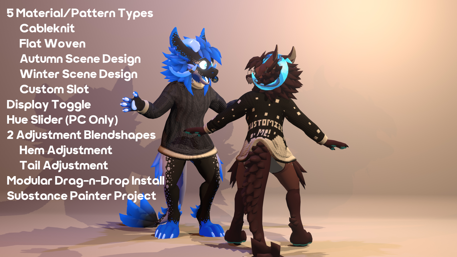 This cozy sweater is designed to work in VRChat and has several features such as: