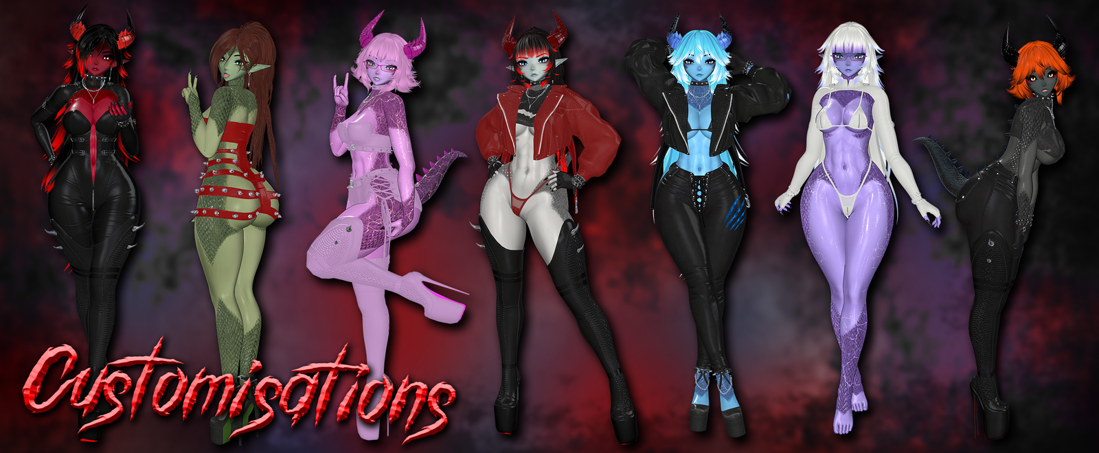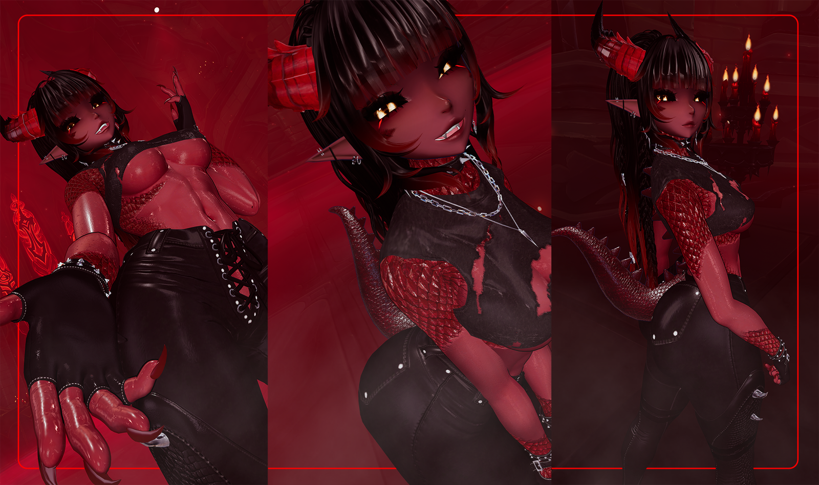 Body Zinpia ✖ Head (do not reuse my edit) Starlynn ✖ Eye Textures Ryuohh ✖ Eyelashes Sivka ✖ Eye Texture Fringes Zinpia, Darcy, Saikura ✖ Hair Zinpia, CompelledInk, Saikura ✖ Hair Texture Cicieaaavr, Saikura's Edit ✖ Wet Skin VeronicaJae ✖ Tattoo Emission MortiVR ✖ Horns EZAvatars ✖ Tail Charizmare ✖ Jacket, Trousers, Scaled Boots - CompelledInk ✖ Ripped Top Daddysenpai ✖ Top, Shorts, Choker, Heels Suki ✖ Spikey Dress Weeeby ✖ Bikini, Earrings, Nails Beaniebaby ✖ Bodysuit Winks ✖ Glasses xero3d ✖ Gloves LKG ✖ Necklace linxx ✖ Retextures done by me :)