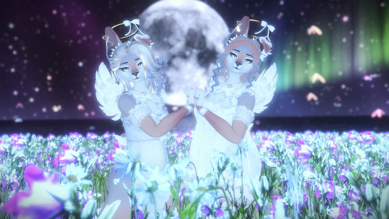 • Facial gestures on their left hand (Hand Open/Fist/Fingerpoint/Victory/Thumbs Up/Hand Gun). Cheri also has GoGo Locomotion and physbones in tail,hair, chest, belly, and butt. Audiolink on the Body Stars and Hair.