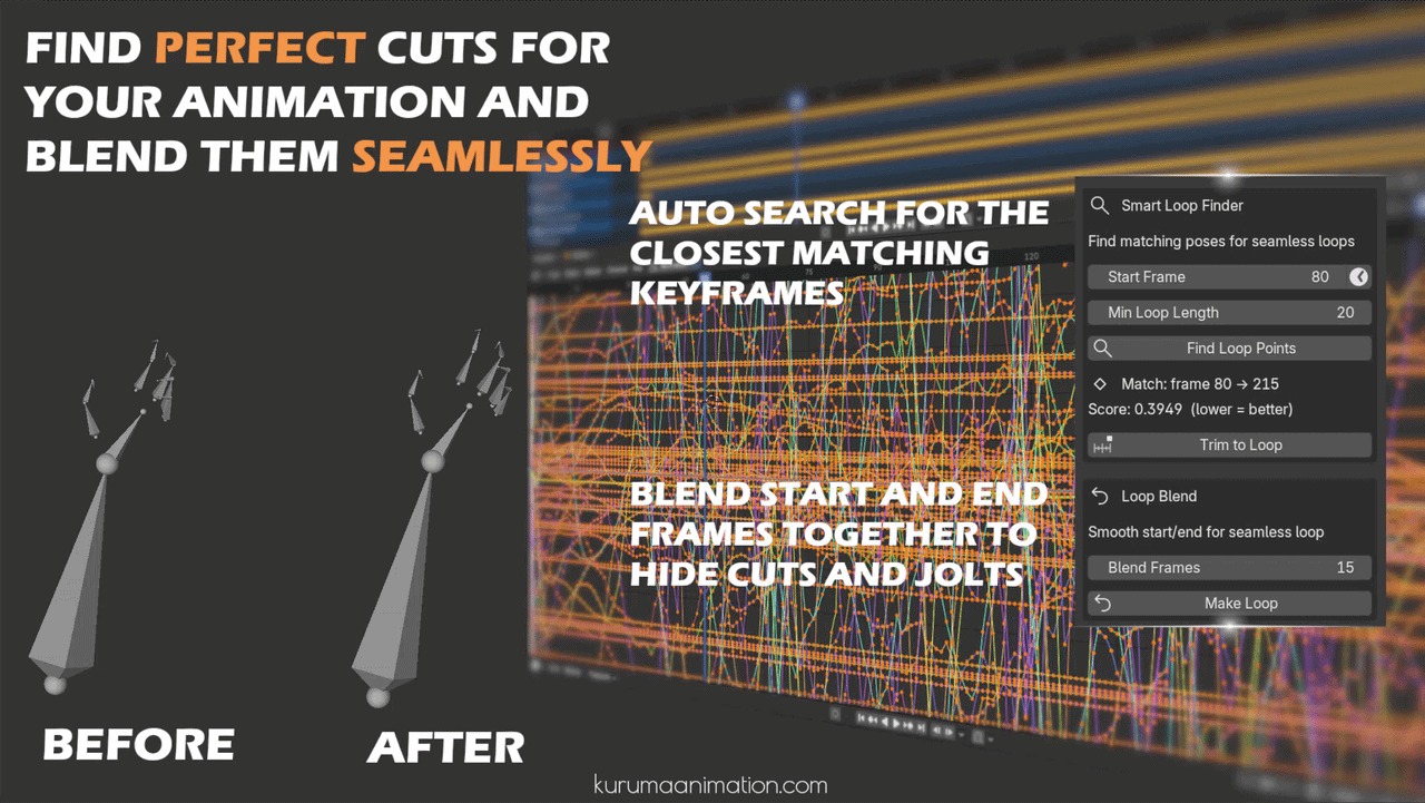 - Smart Loop Finder finds the closest matching pose to your reference frame for clean loops