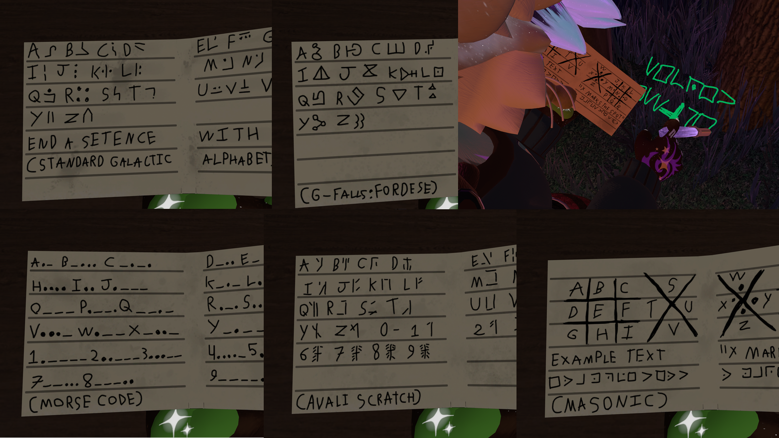 i have a fascination with cryptography. and there's some vrchat worlds that have substitution cyphers, one of my favorite kinds of cyphers. so this book has the translation sheet for a few different ones, like avali scratch, standard galactic, and Morse code, even tho that's not a substation cypher. and i plan to add more. so if you ever come across some space looking text you'll know what it says.