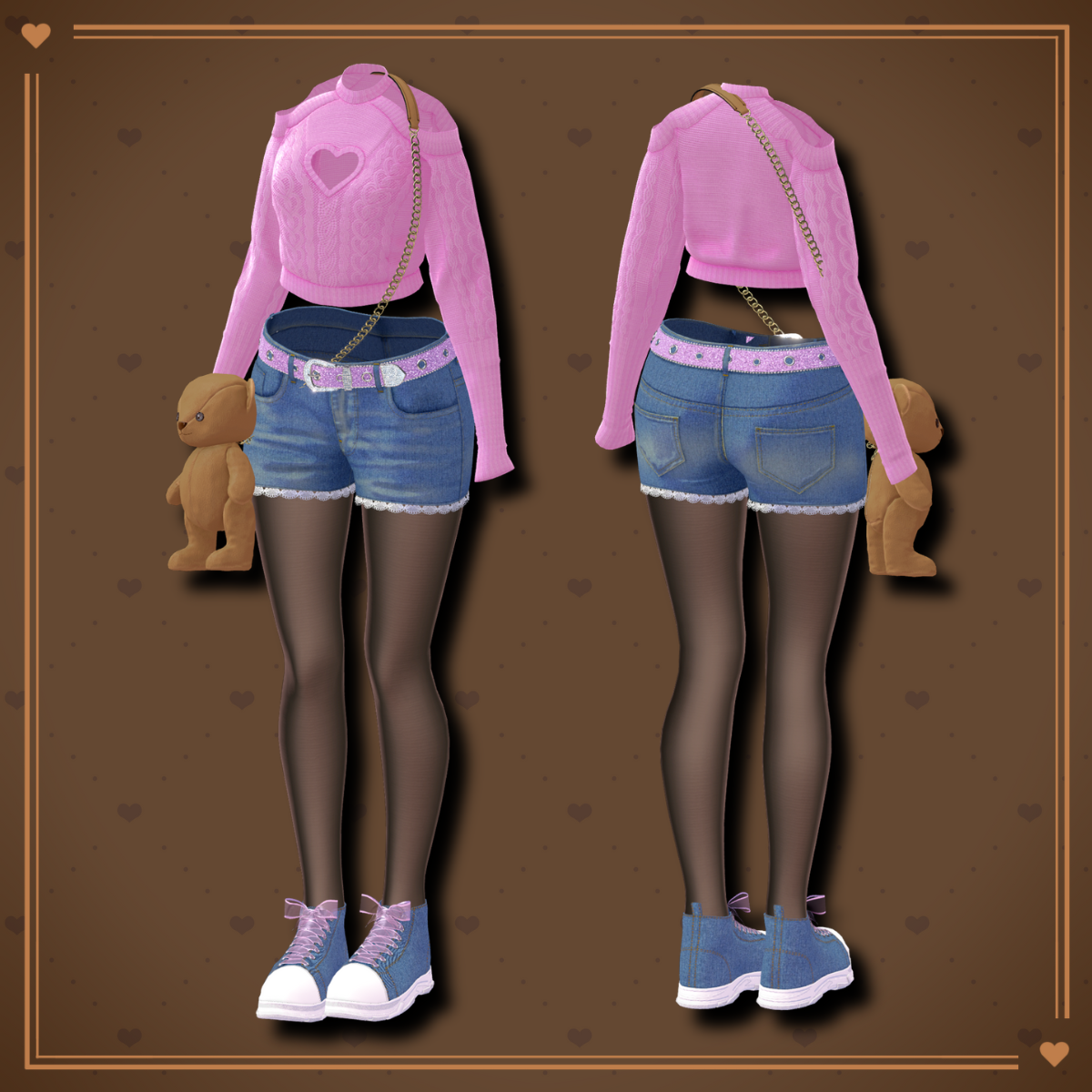 A coordinated outfit featuring a cable-knit sweater with a heart-shaped cutout at the chest, paired with denim shorts and sneakers. Lace and ribbon details add cute accents to the casual base design.
