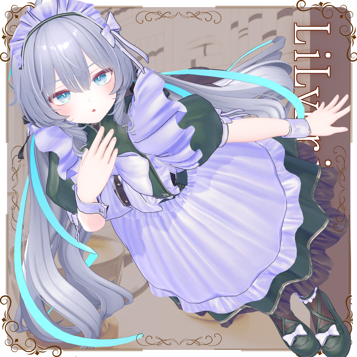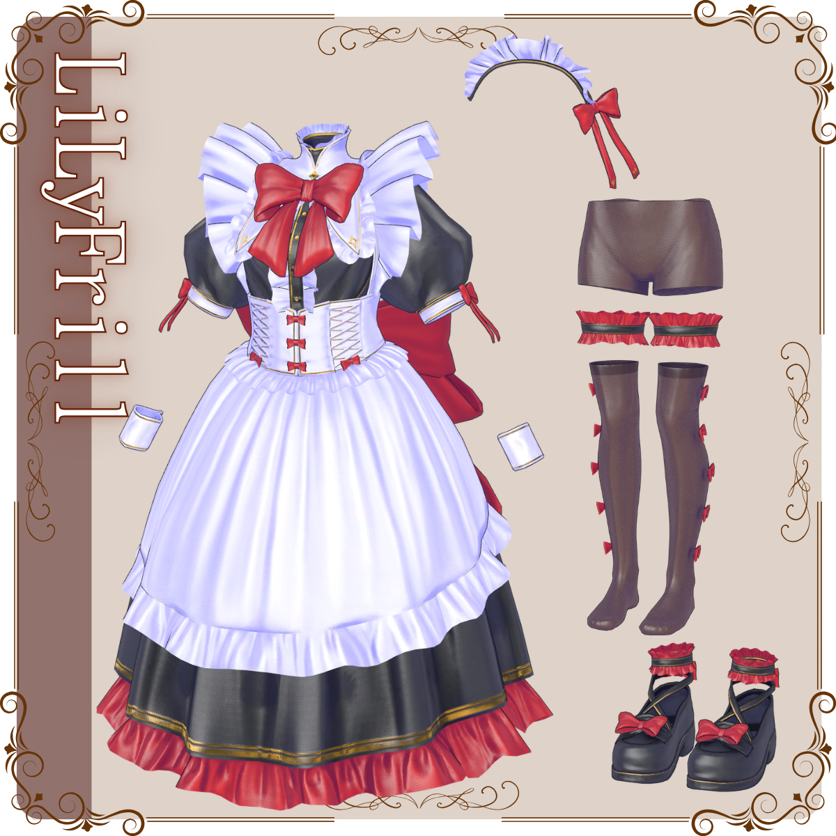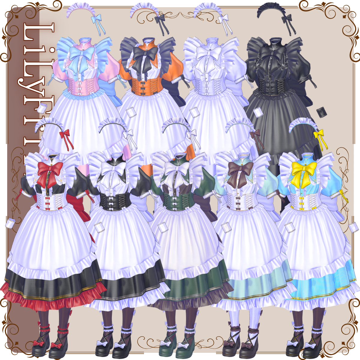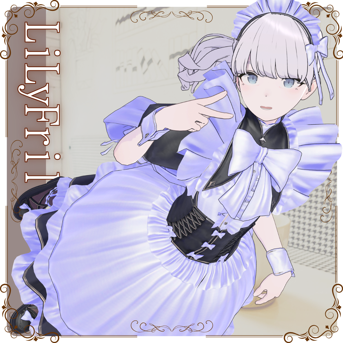 A maid outfit model for VRChat featuring a classic silhouette, enhanced with a large ribbon, frills, and a distinctive stand-up collar.