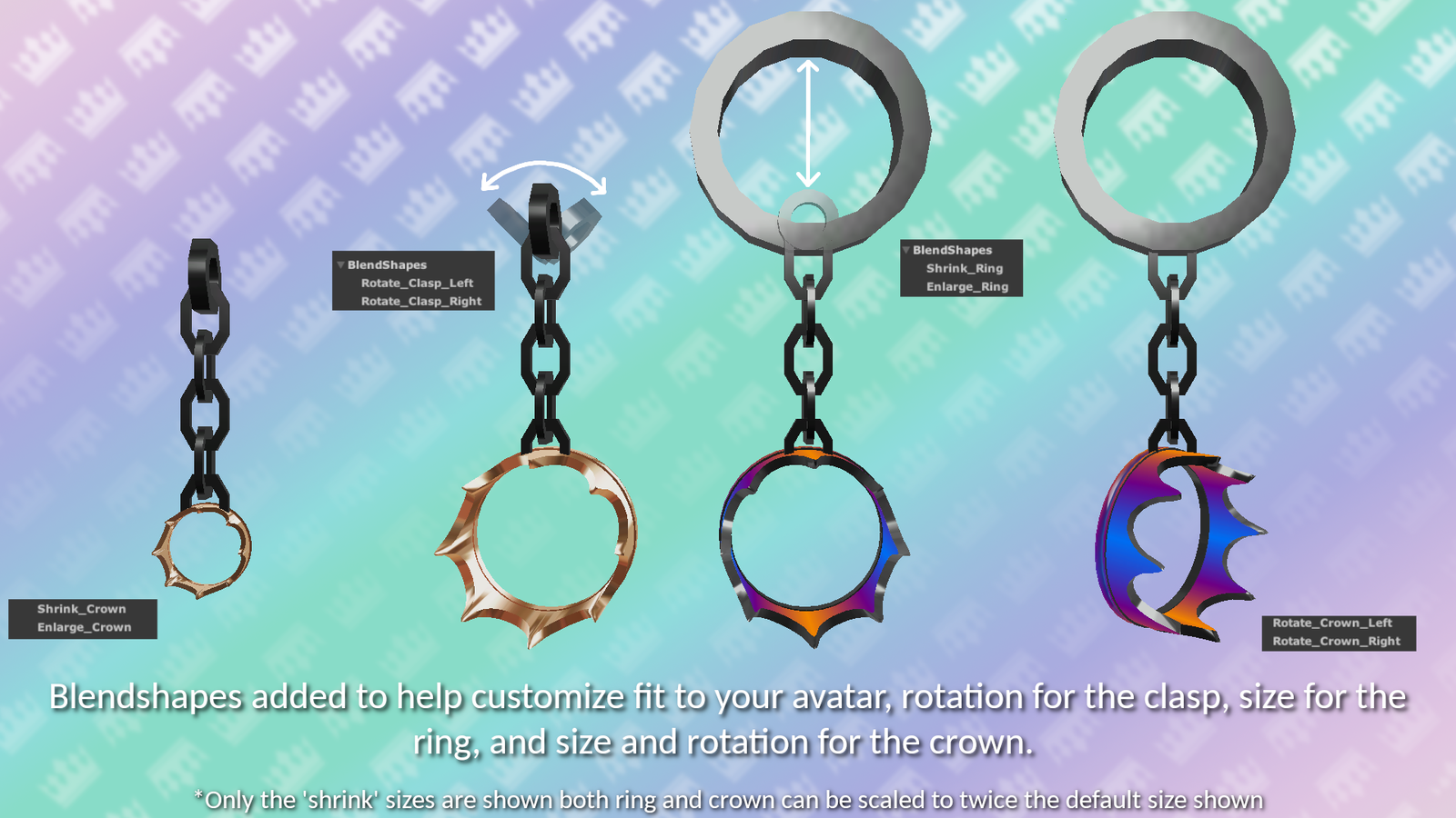 - You can expand the drop down and click the second 'CrownClasp' or 'CrownRing' and adjust blendshapes in the inspector on the right if you need to change ring/crown size, or clasp angle