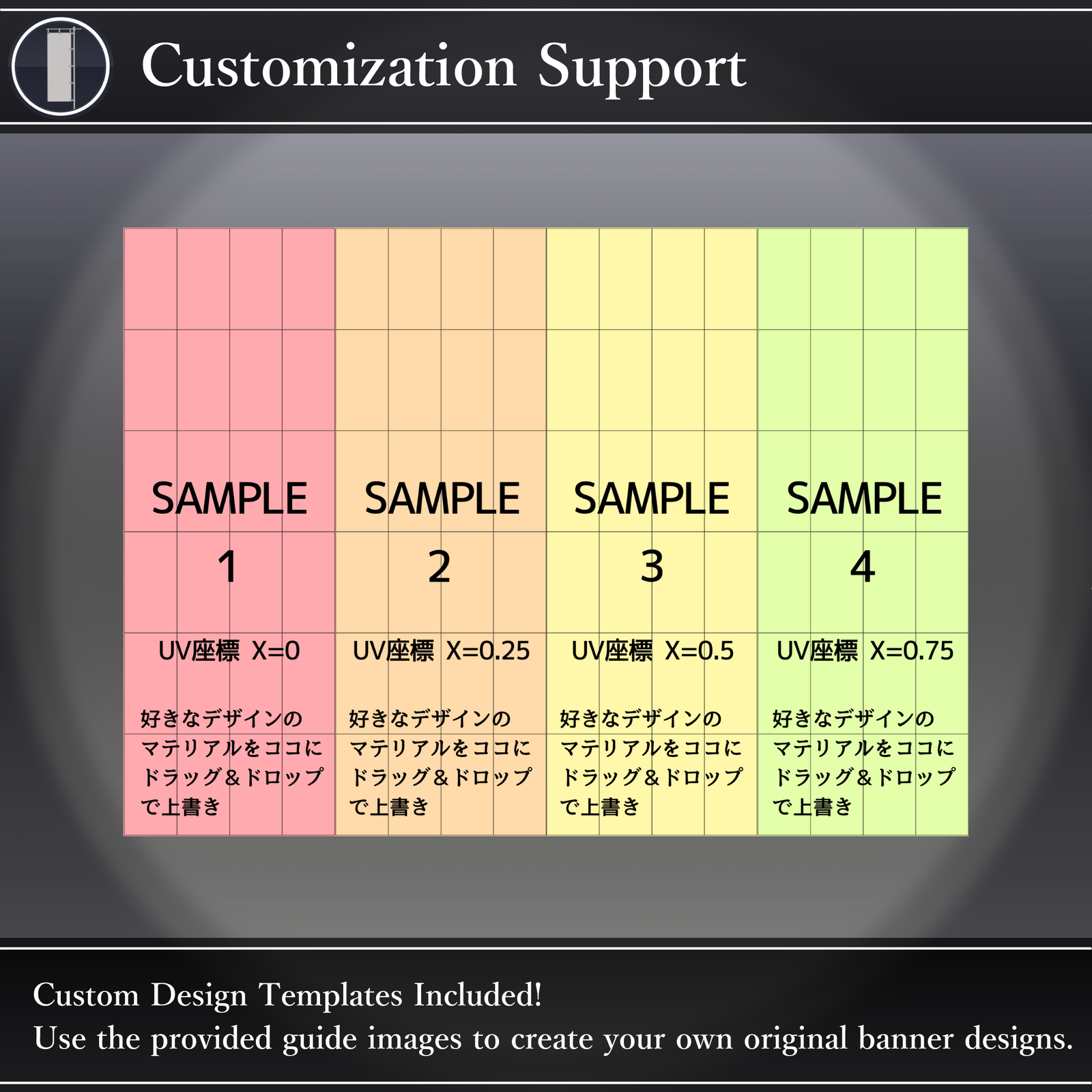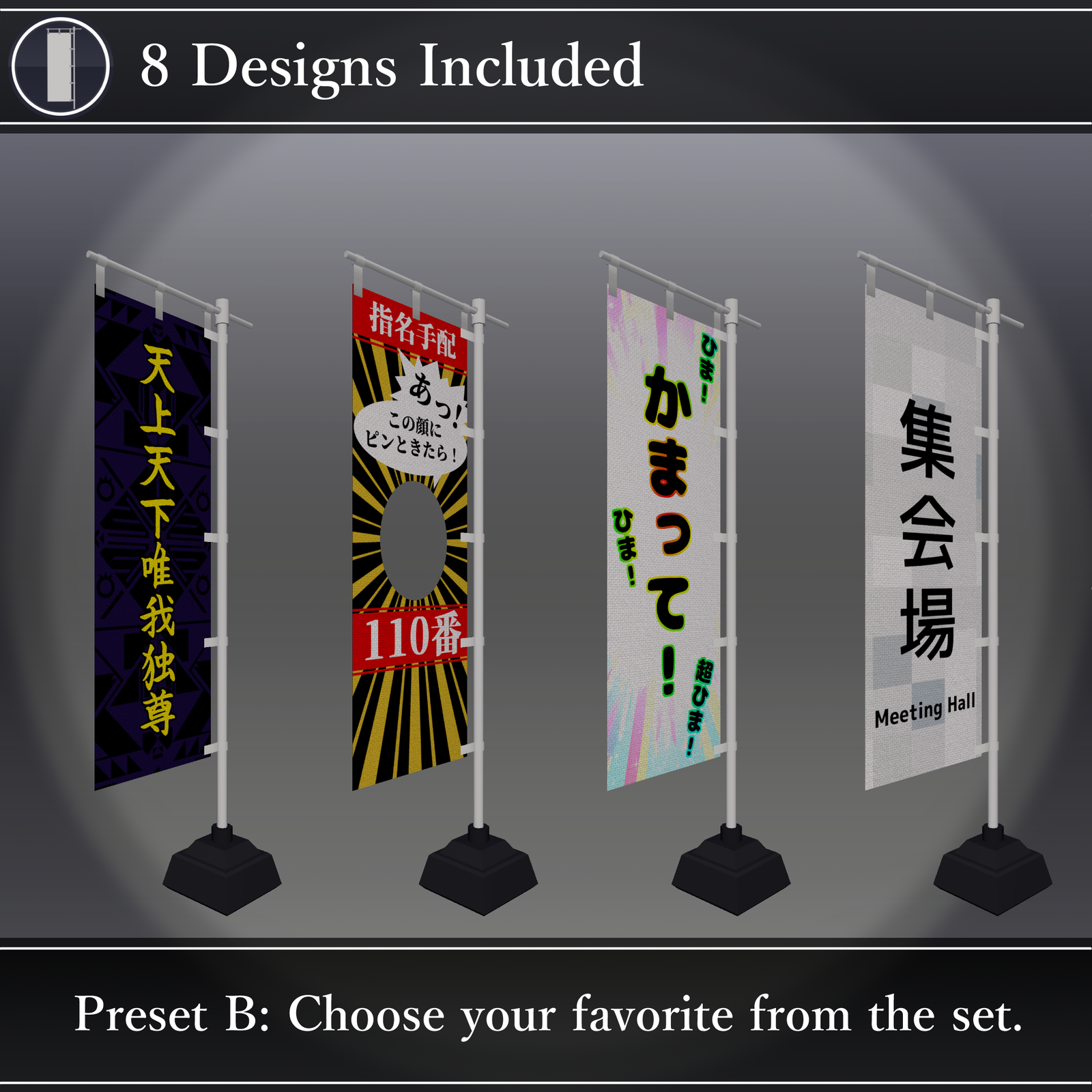You can switch between 4 different design slots, and choose from 8 default designs included in the pack. The gimmick allows you to switch between two states: "Carry Mode" (wearing it on your back) and "Place Mode" (fixing it in position). By preparing your own images, you can also set up your own original banners.