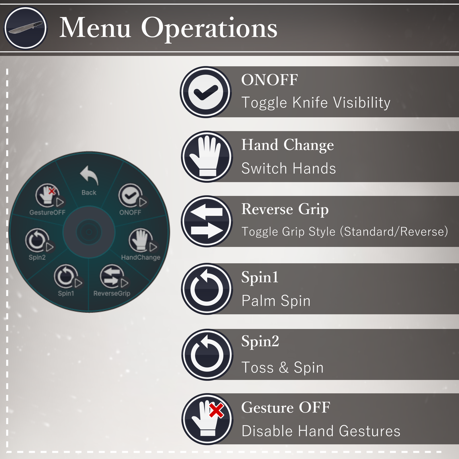 You can perform various actions including: Summon/Dismiss, Right-hand/Left-hand swap, Standard/Reverse grip, and two types of spinning actions.