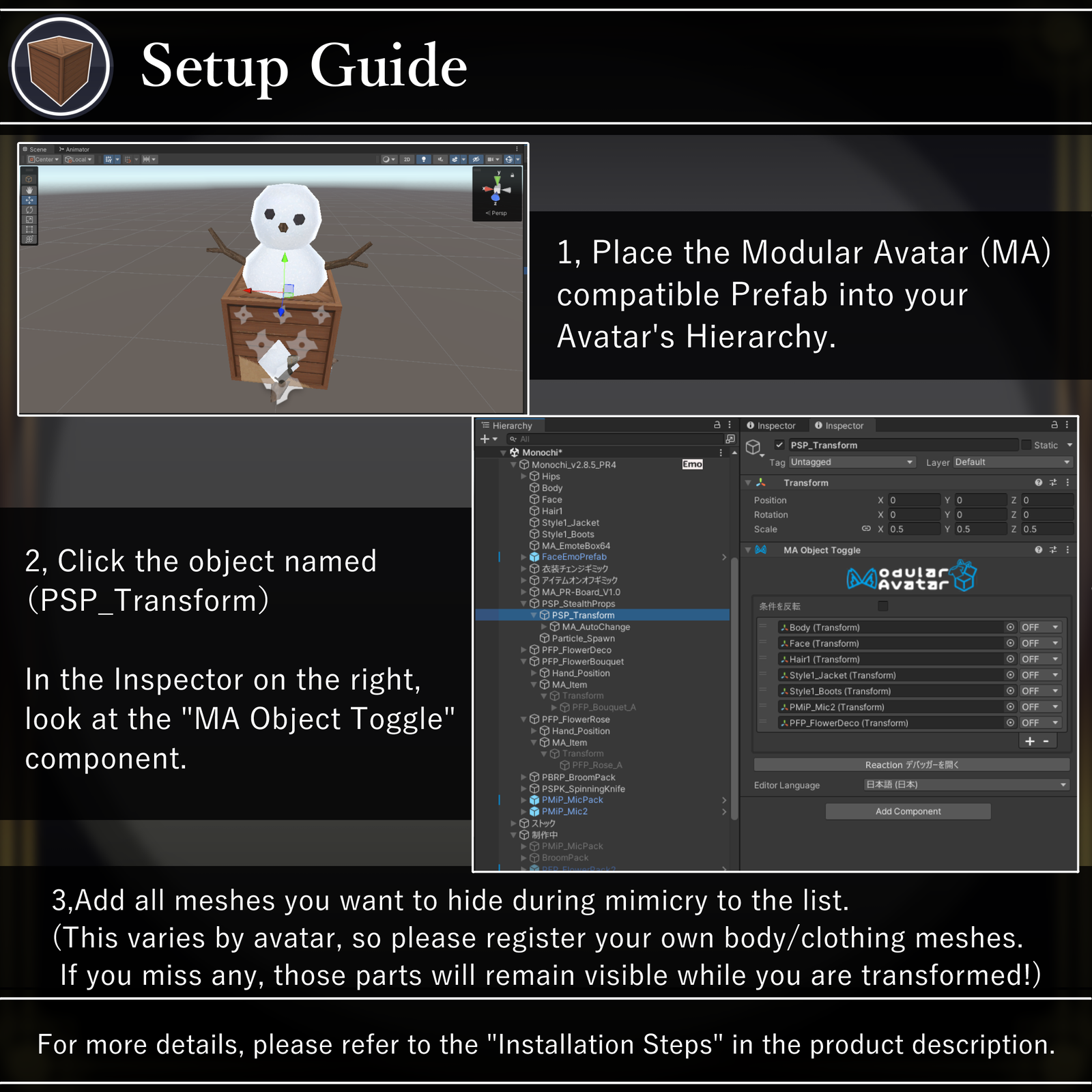 "StealthProps" is a transformation gimmick designed for VRChat. It is compatible with Modular Avatar for a quick and easy setup.