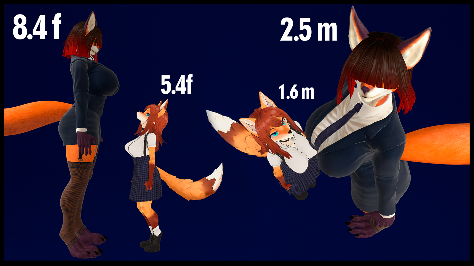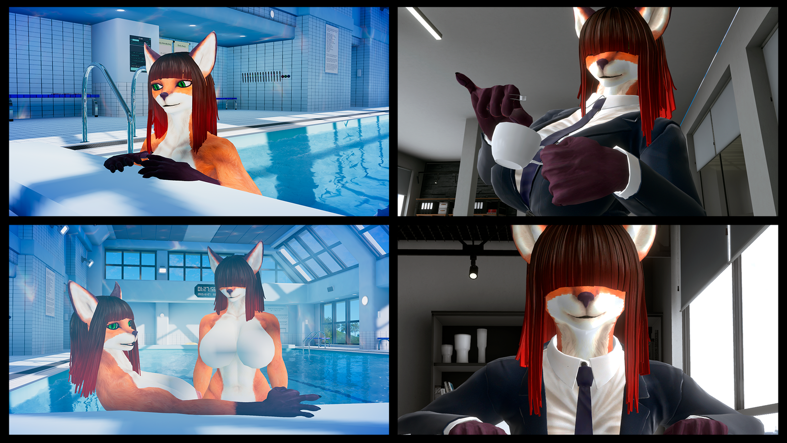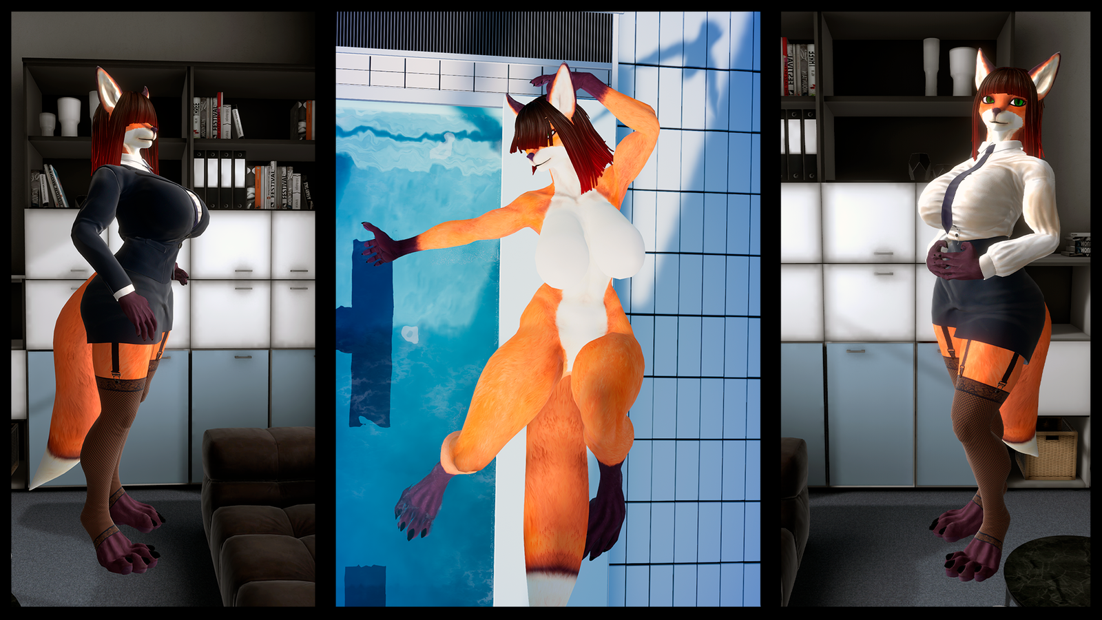 Since Avery works in an office, her main outfit is a formal business suit consisting of a jacket and skirt. Under the jacket, you can see a light shirt through which her red fur shines. For underwear, she wears black lace lingerie, stockings, and a garter belt.