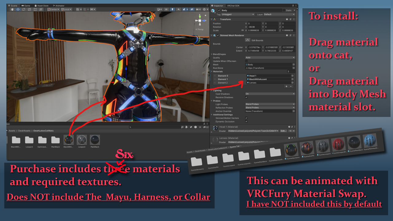 Each one uses the same hand-painted seams and normals to mimic a tight latex suit. The claws are black on the two black colorways, and metallic silver on the Leopard. On the back is a textured zipper. No extra meshes or geometry required or included. These are a drop on replacement for the Mayu Body material.