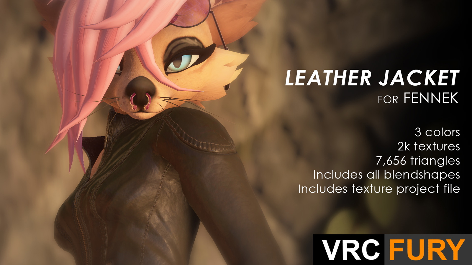 A stylish leather jacket made for the Fennek! Features a leather jacket with premade materials and Simple drag and drop installation with VRCFury! Comes with 3 premade materials + SPP Project!