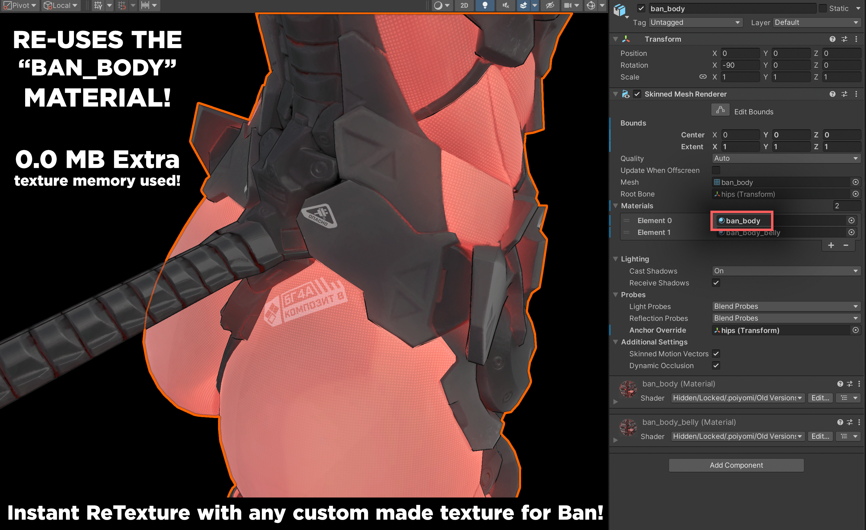 - Reuses "BAN body" material, any custom skins will be usable on this automatically!