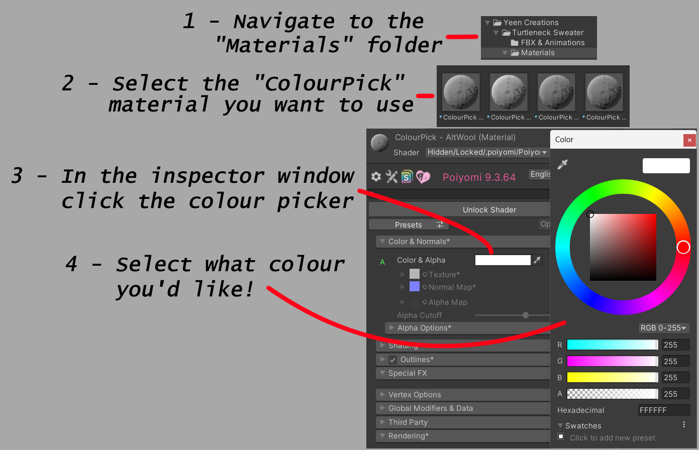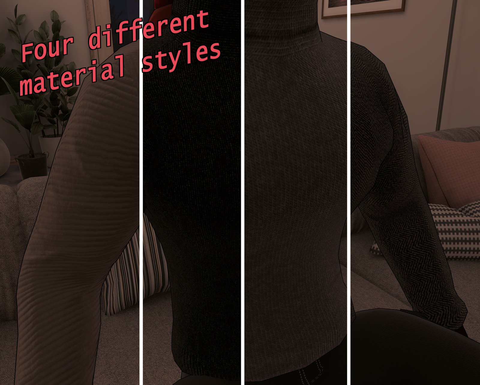 In addition to the default materials and colours provided there is an additional ColourPick material for each of the different sweater styles that you can use to customise the colour to your liking.