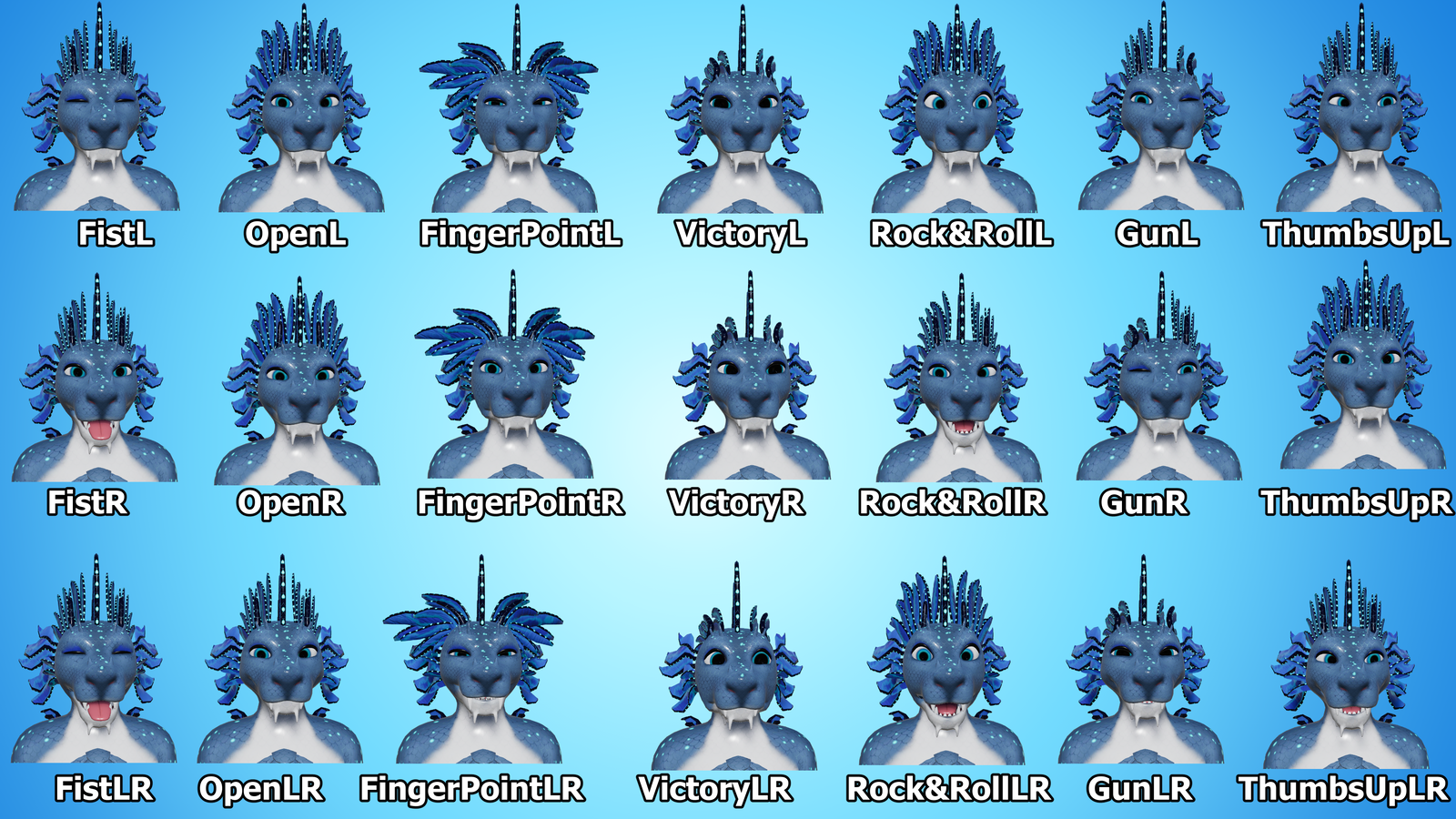 - Expression Menu Toggles - Happy, Sad, WinkL, WinkR, Squint, ClosedEyes, Fear, and Blep