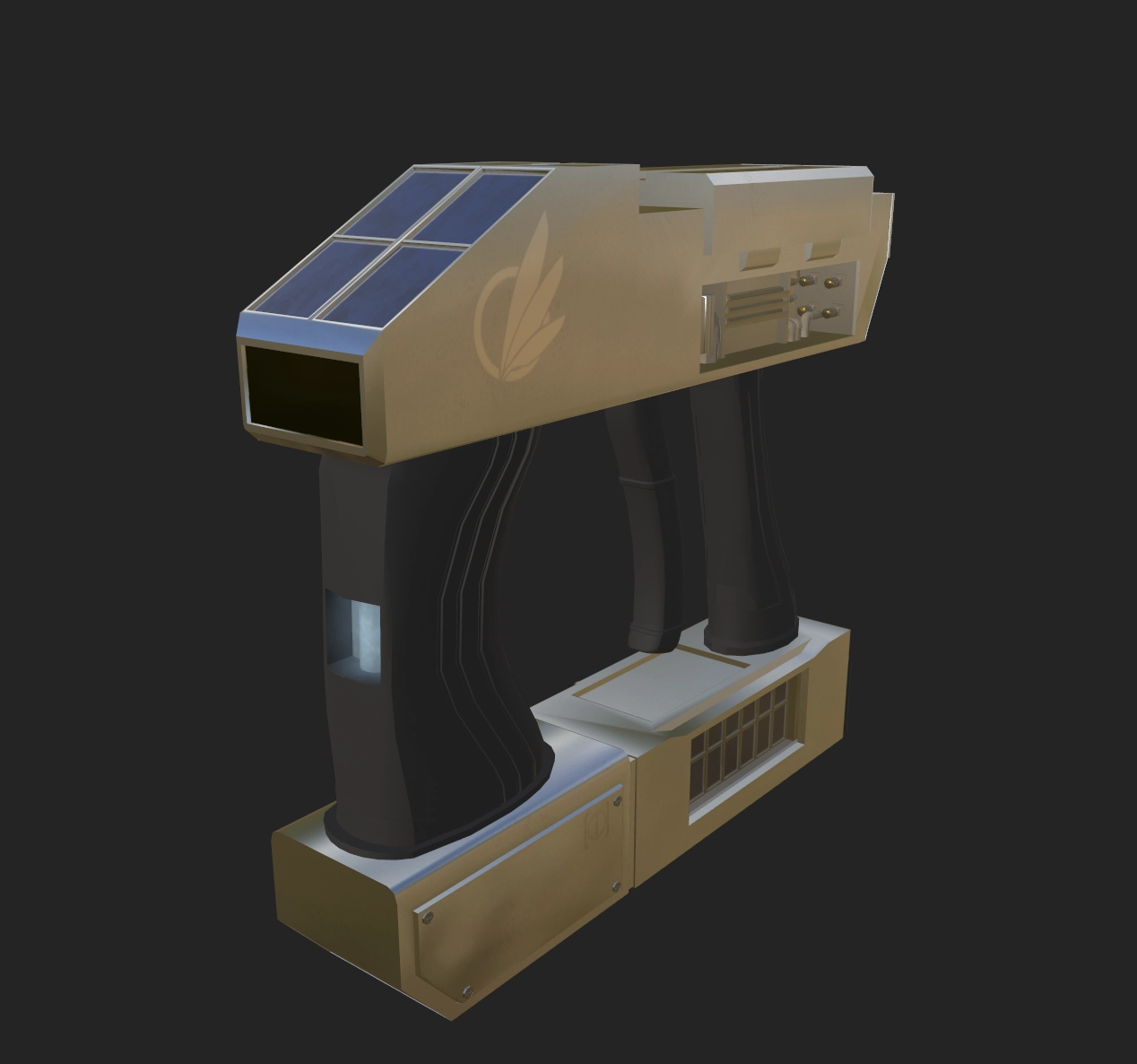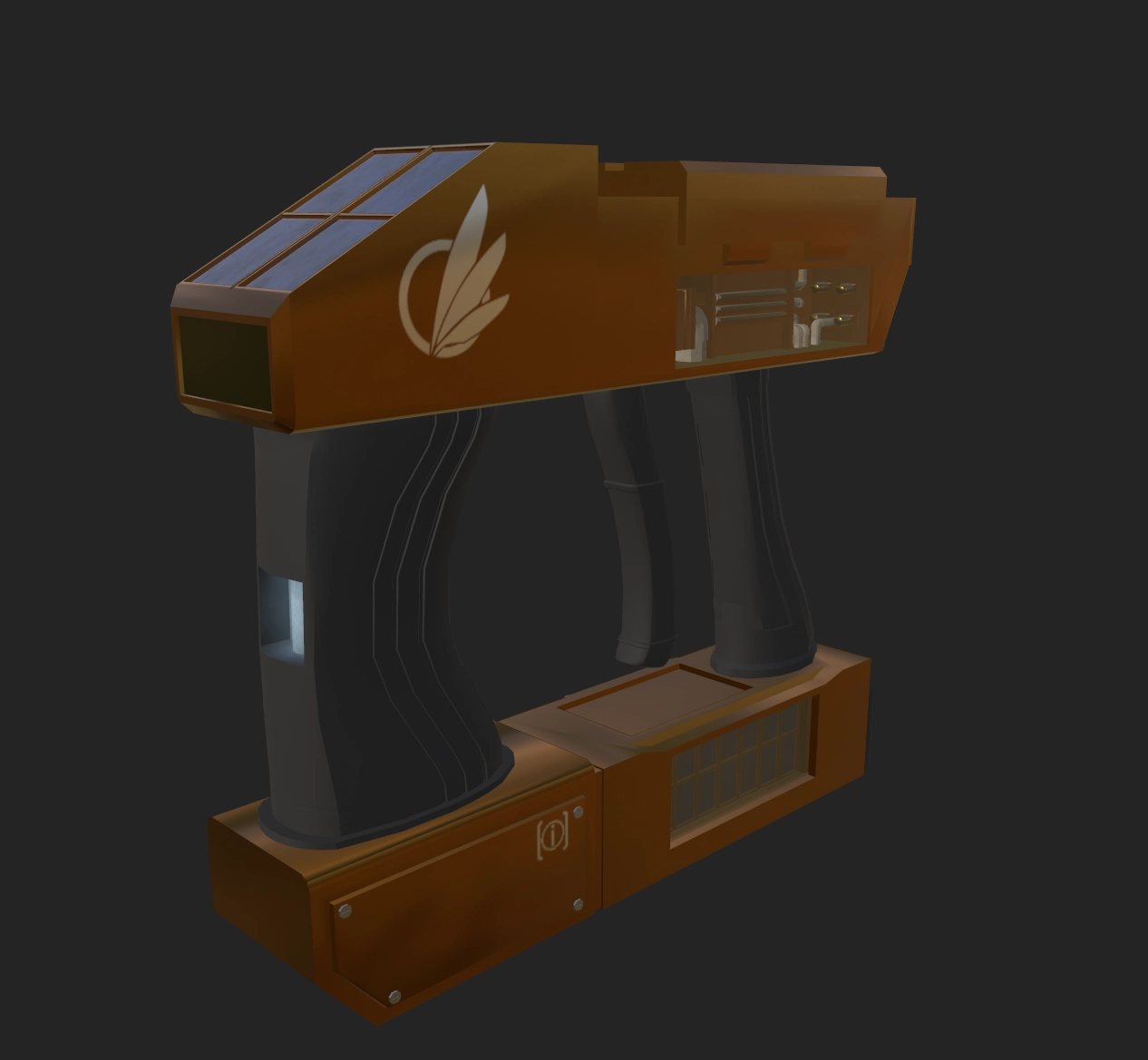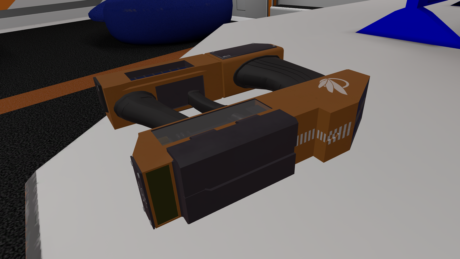 An Avali Adventure Corps RMM-6 Second Generation Handheld Matter Manipulator. This model has been modified to support the storage of pressurized gases and fluids with the help of tanks, vials, and pumps. It contains eight cable ports for convenient data offloading/manipulation, as well as a integrated front mounted scanner module which is capable of reading barcodes of other models amongst other things. It includes two built in solar arrays for Auxiliary power generation in the field, in the event that the standard Quark Gluon plasma storage cell fails. Sure to help you with all of your research needs!