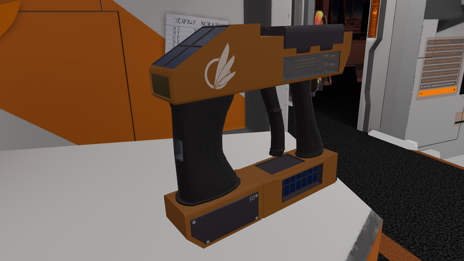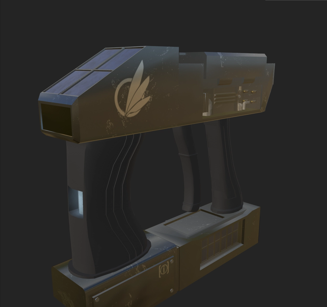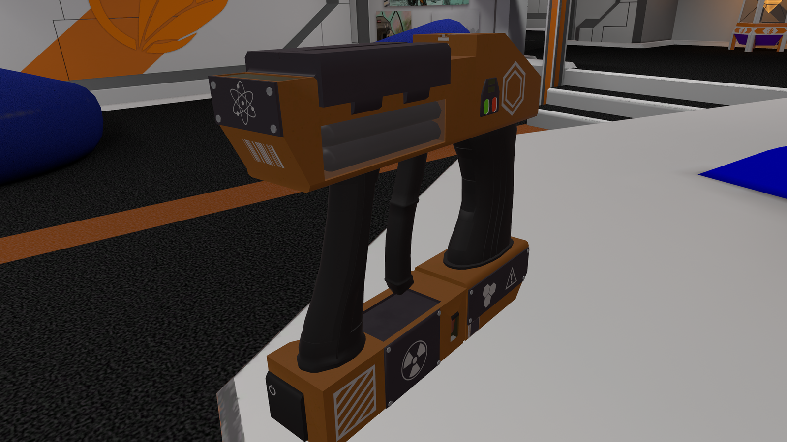 An Avali Adventure Corps RMM-6 Second Generation Handheld Matter Manipulator. This model has been modified to support the storage of pressurized gases and fluids with the help of tanks, vials, and pumps. It contains eight cable ports for convenient data offloading/manipulation, as well as a integrated front mounted scanner module which is capable of reading barcodes of other models amongst other things. It includes two built in solar arrays for Auxiliary power generation in the field, in the event that the standard Quark Gluon plasma storage cell fails. Sure to help you with all of your research needs!
