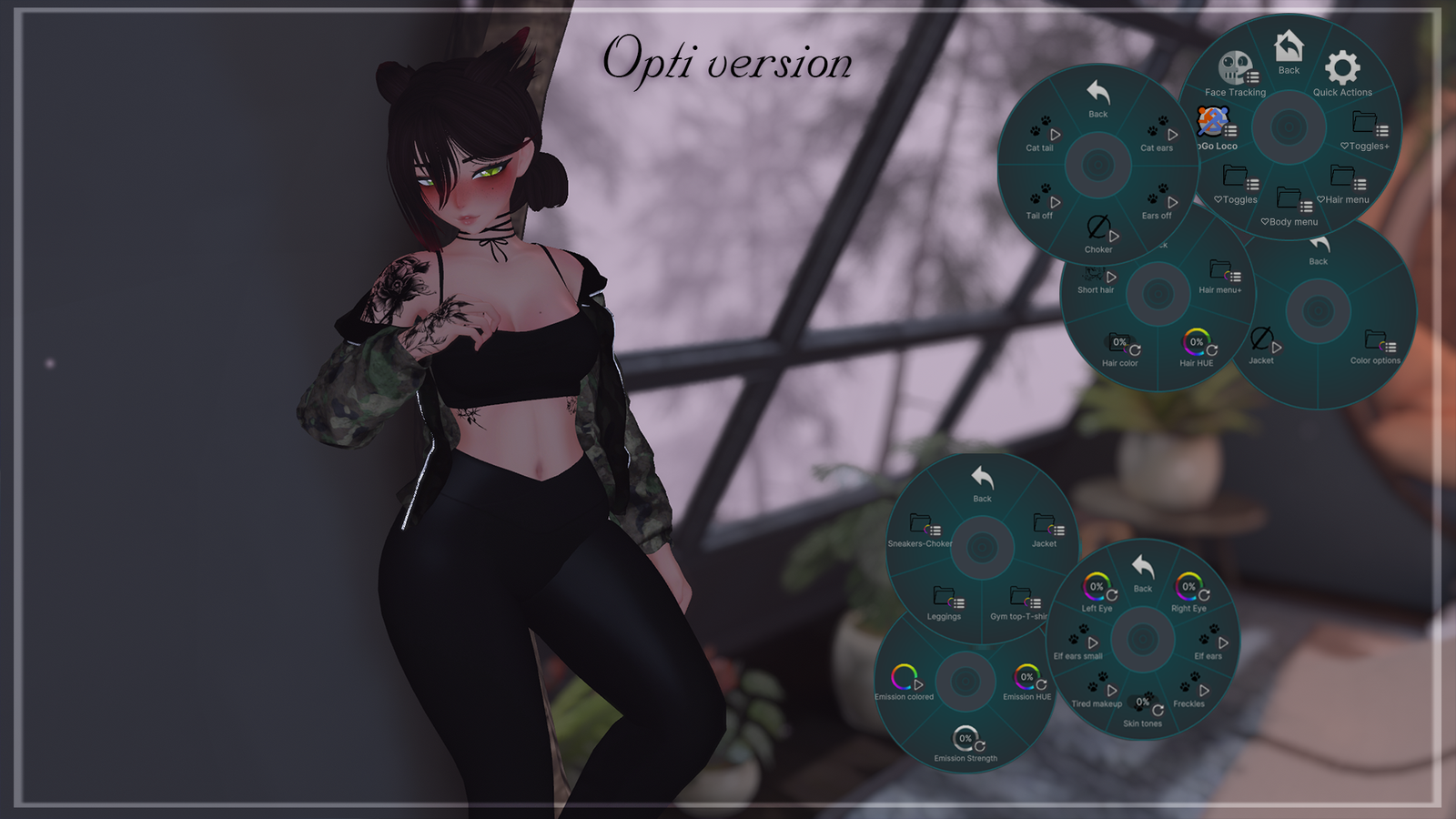 - Hair swap (bun)+hair colors+hair hue+emission strength+emission hue - Body toggles