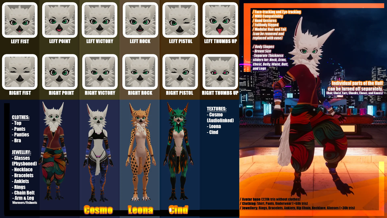As always, I have free public versions of my avatars uploaded. You won't be able to customise them but they have full functionality, so if you want to demo it or can't afford it yet, please use those instead of just pirating or ripping the avatar immediately. I have put a lot of work into this, and at least those versions have my contact info in them. :)