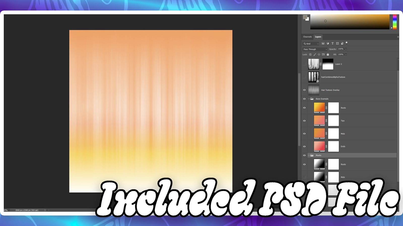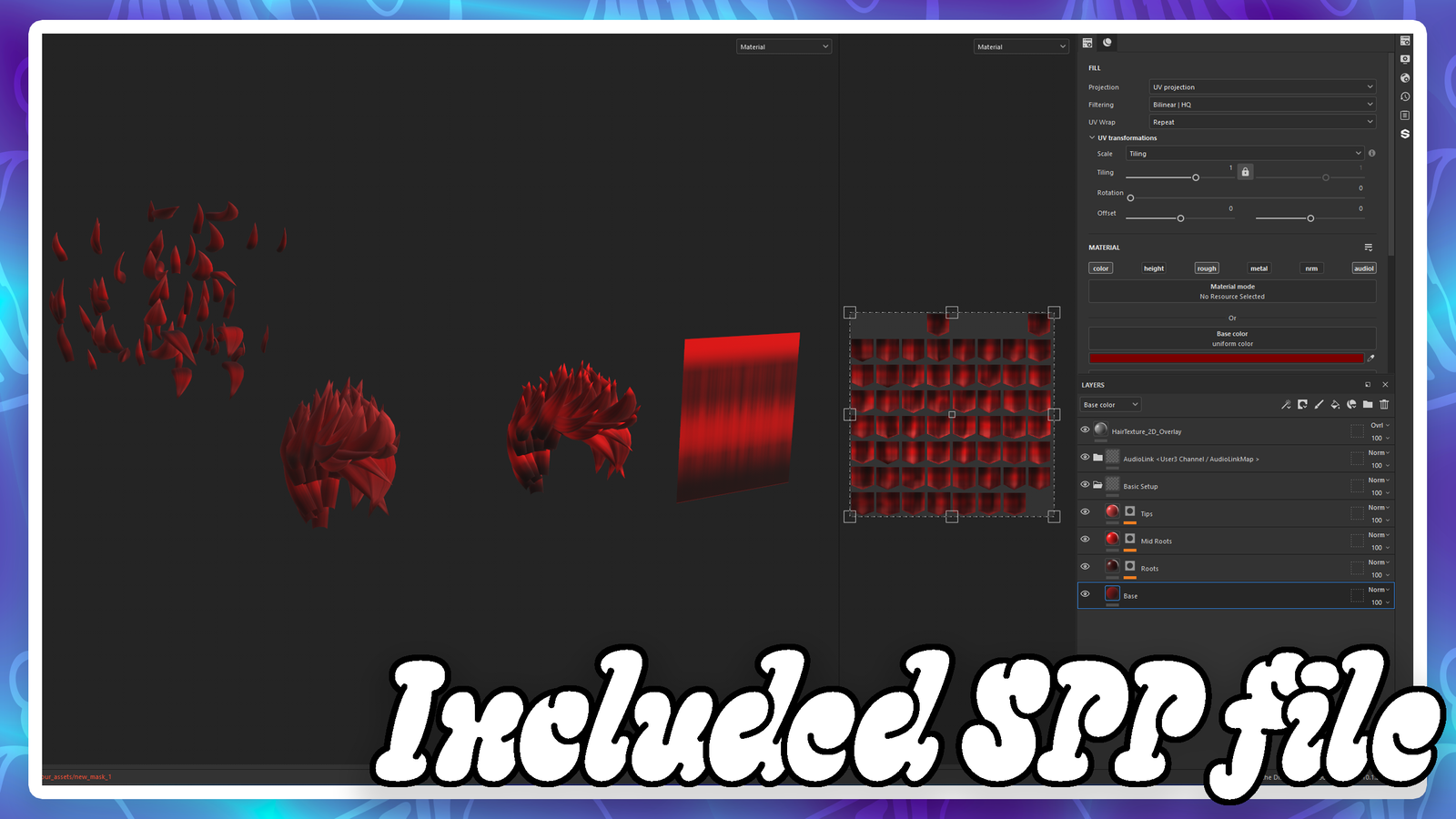 • Two variants included, one for 3D Texture UVs (individually paintable hair pieces) and one for 2D Texture UVs (Generally uses a flat pre-made texture)