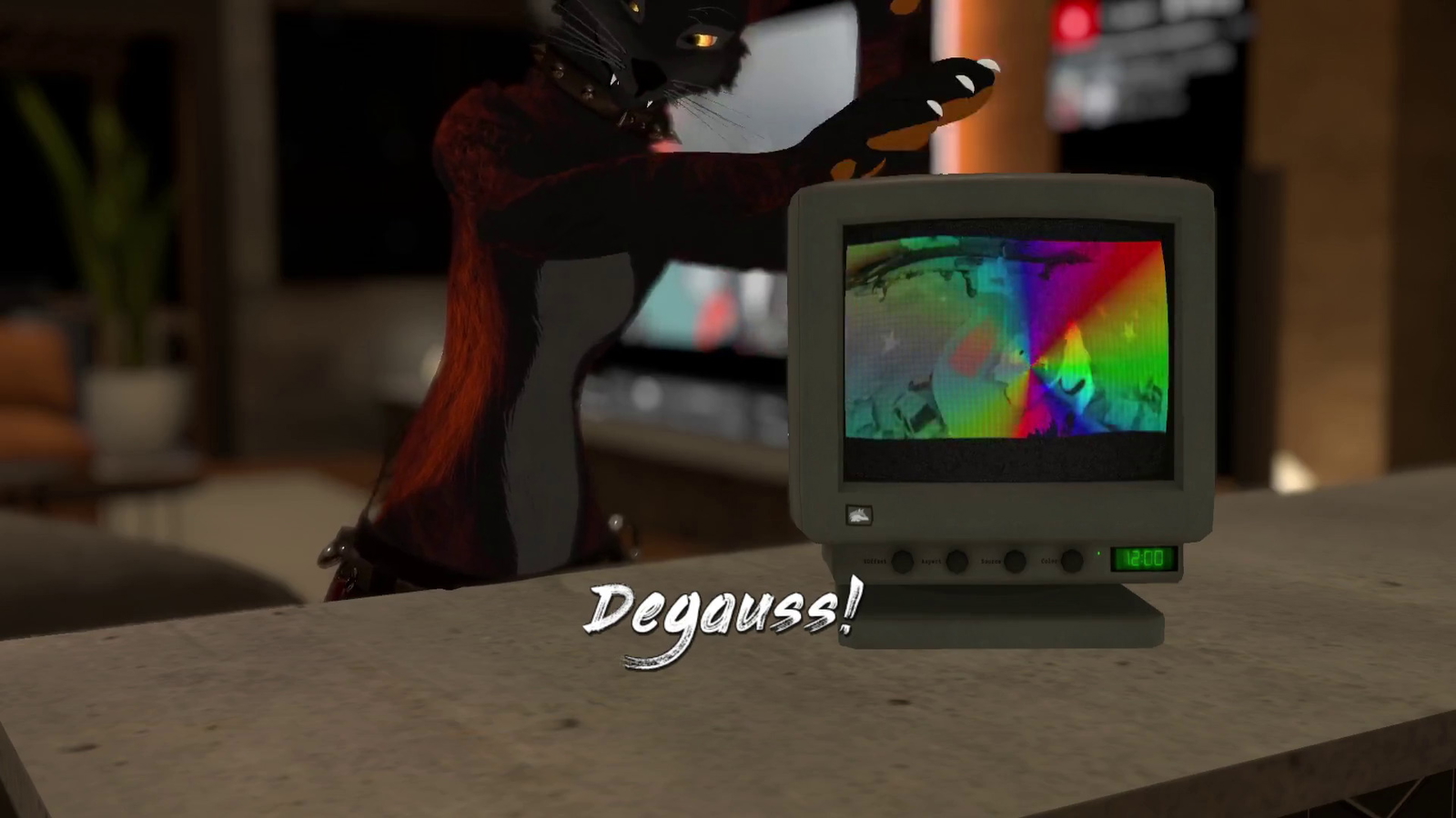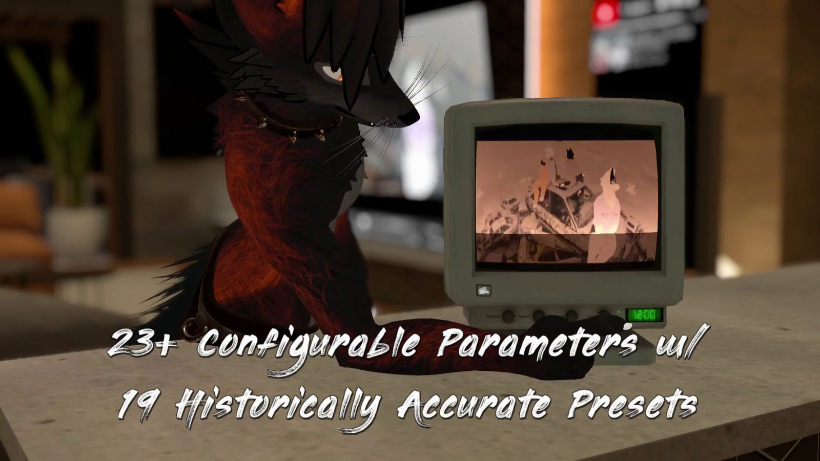 This is a CRT Shader in a Poiyomi module for use in your own assets, and to show you what's possible with it I've included a realistic retro CRT! Drop a CRT into the world to show off videos, animations, or play whatever's on the screen in (most) video player worlds. Users can even smack it on top to make it degauss, or use the knobs up front to control its settings.