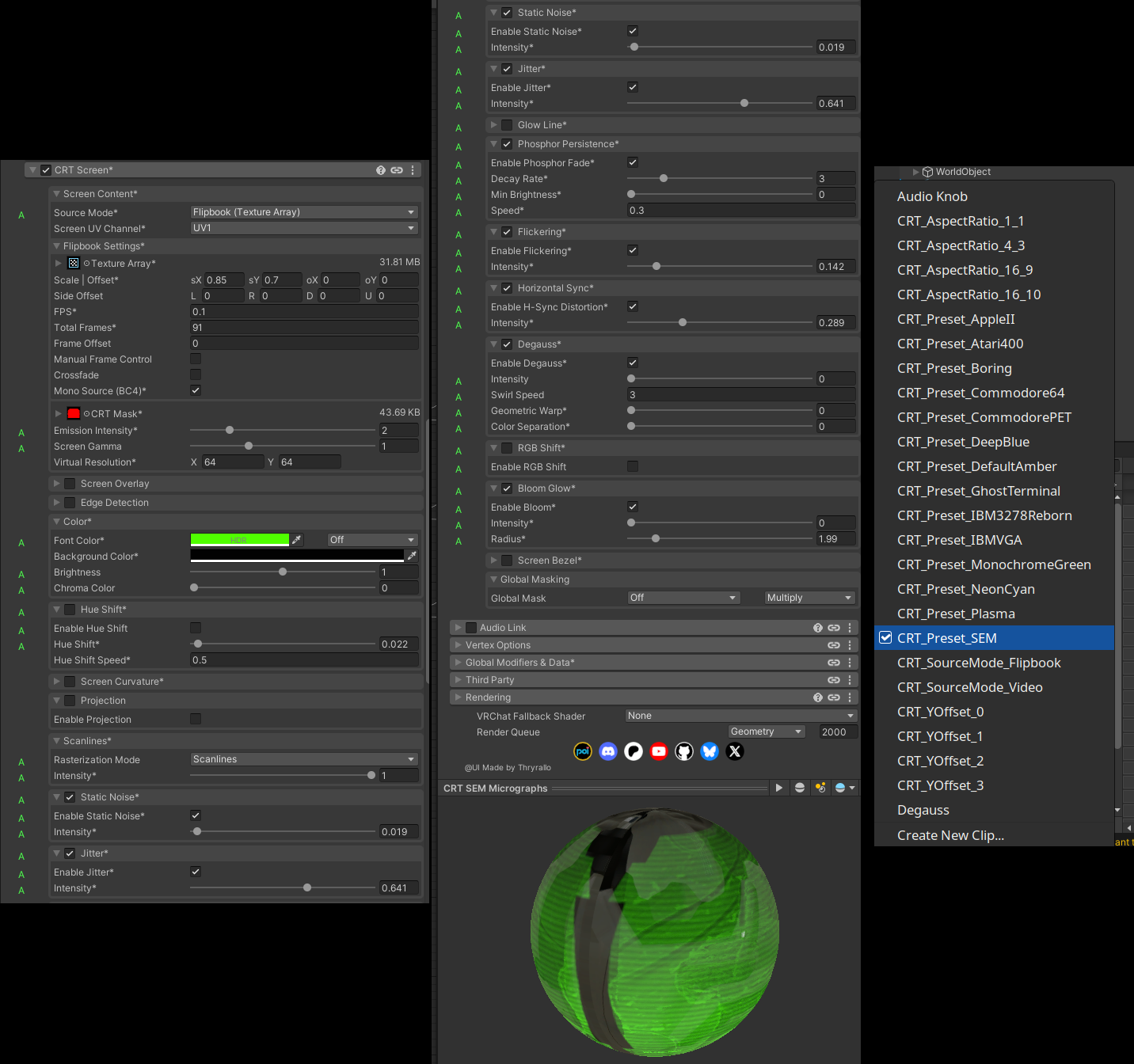 The CRT shader is packed with features that will be useful to asset or avatar creators. It has realistic retro effects from various eras of monochrome and color monitors/TVs, and has presets for my SEM, the Apple II, Atari 400, a generic color CRT, Commodore 64, Commodore PET, a blue/amber/ghosting terminal, an IBM 3278, IBM VGA, Monochrome Green, Neon Cyan, and Plasma CRTs. I started with a port of Swordfish90's amazing "Cool Retro Term" and added some features onto it:
