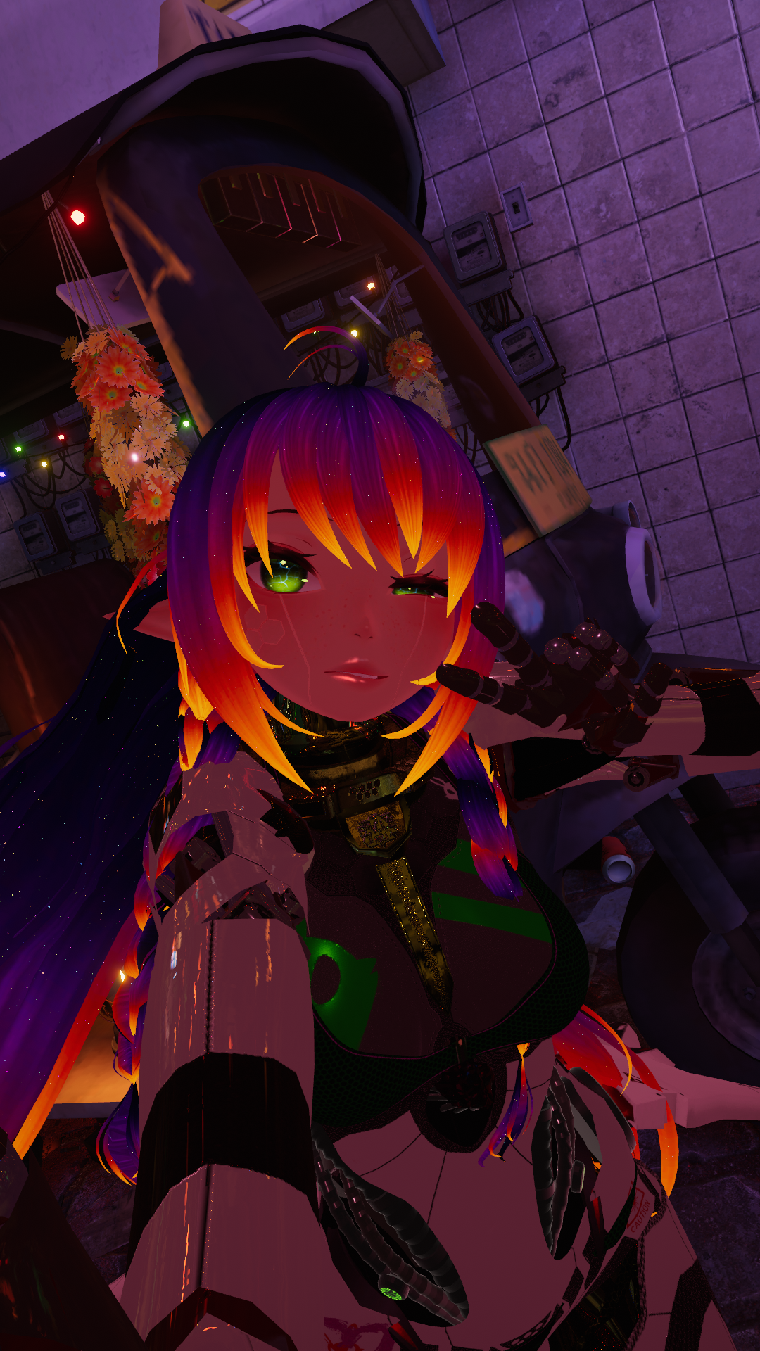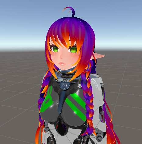 This is my first release – now updated to Version 1.29! a cyberpunk elf android with glowing purple-orange gradient hair, sharp elf ears, vibrant green eyes + freckles, and sleek robot armor featuring a gem Heart core.