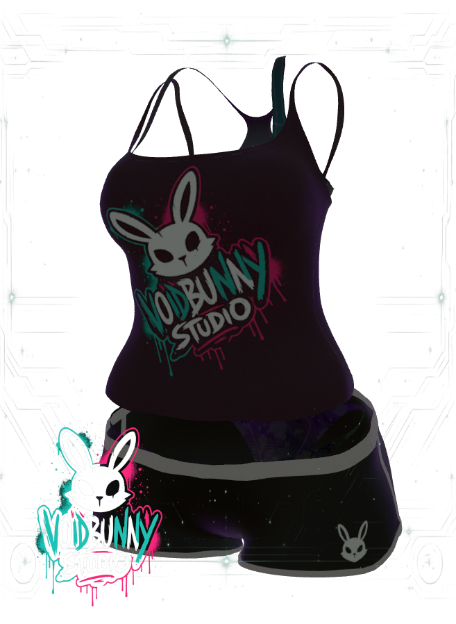 - Tank Top: Deep cosmic purple camisole with explosive neon teal, hot pink, and cyan drip splatter. Features the fierce VoidBunny Studio bunny front and center – glitchy outlines and starry accents.