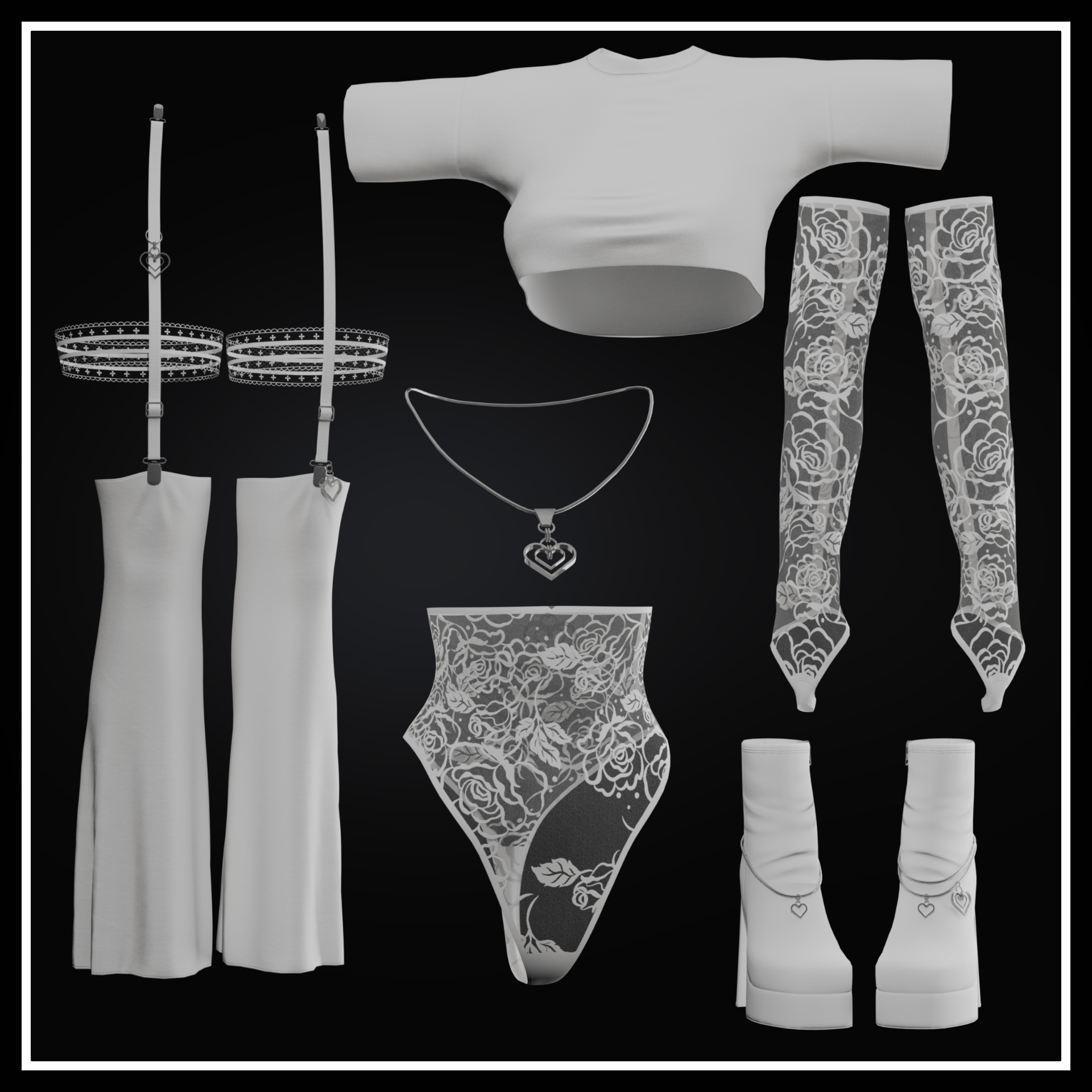 πͺ shirt, gloves, half-bodysuit, necklace, thigh garter, leg warmers, boots