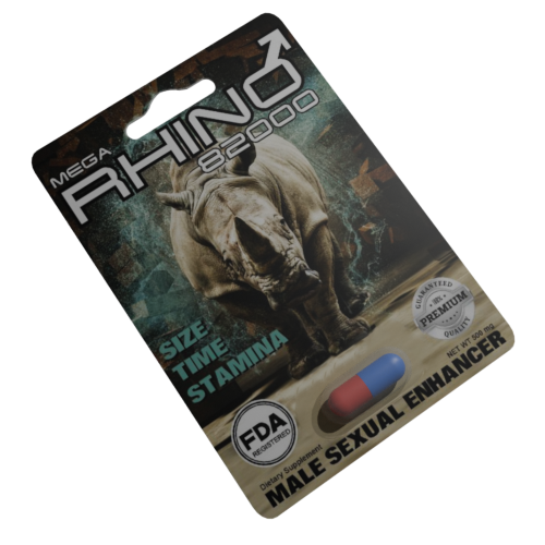 "Mega Rhino 82000 Size Time Stamina FDA Registered Guaranteed Quality 100% Premium Dietary Supplment Male Sexual Enhancer Net Wt 500 mg" as seen in SlashCo VR!