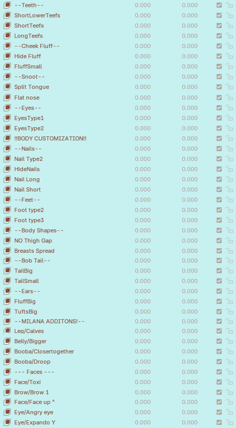 Sliders: Coat Hue, Face Shape, Chest Size, Rear Size, BMI, Ear Types, Face Types, Clothing Hue, Shader Brightness, Lashes