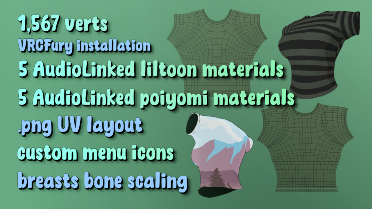 The TEE is the third item from the Vio BASICS set! Fitted casual t-shirt with short sleeves, five audiolinked preset materials for either liltoon or poiyomi shader, in-game hue slider, and plenty of blendshapes to layer and style with virtually any outfit.