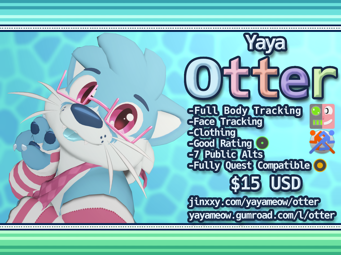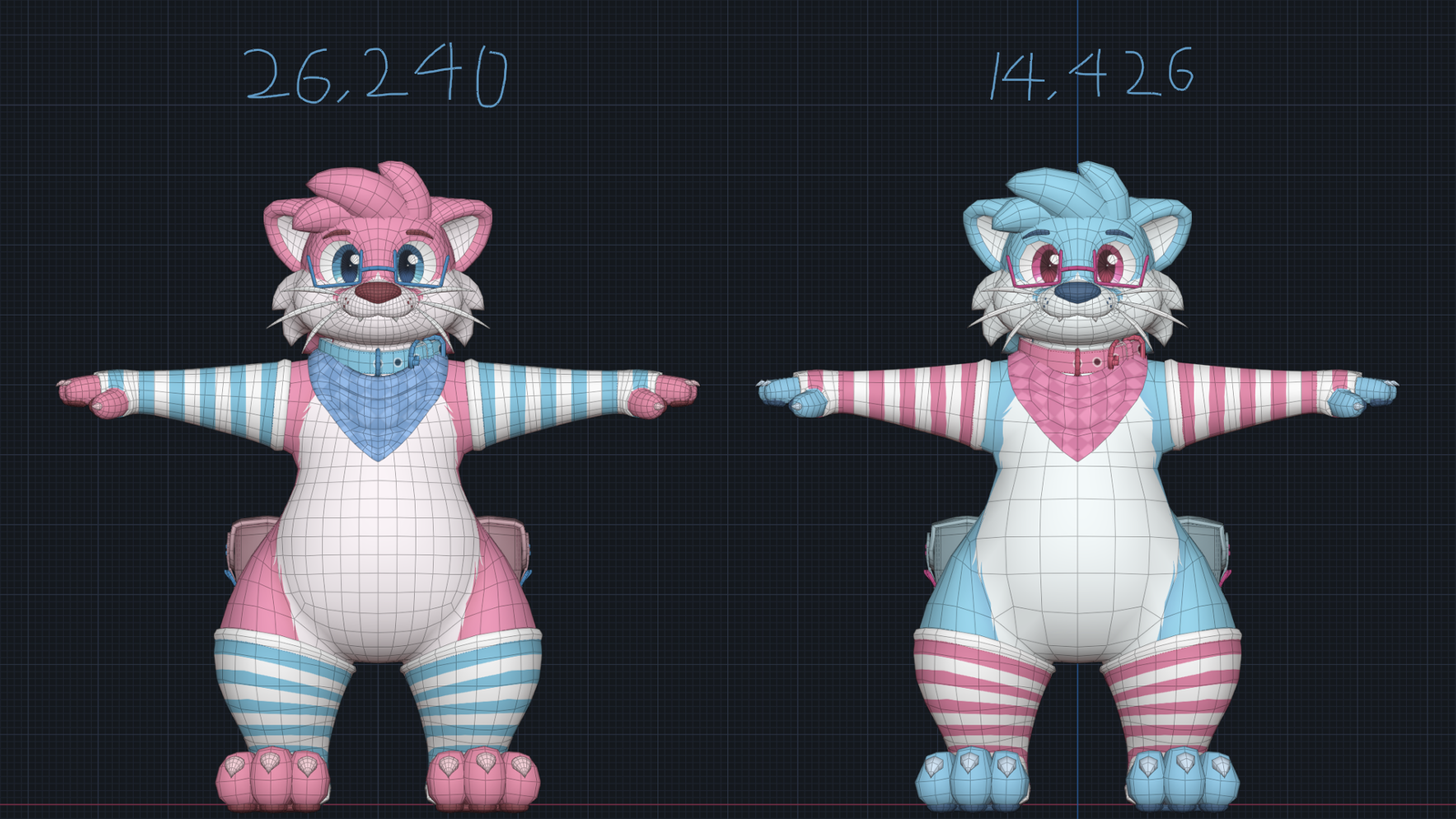 What is included? -Full body tracking support, that attempts to make those wonky cute little legs function :3 -Face tracking, to the extent at which I can verify on a Quest Pro -Normal hand/face gesture presets -Weight slider, leg/hip distance slider, and a few simple toggles for hair shape, fluff, and claws -"Fursuit follow me" style eyes or normal VRChat or Face tracking rotatable eyes. -2 sets of built in clothing -Good rating by default on the PC version, and Medium on the included Quest version -Speaking of, A fully compatible, PC parity Quest model and avatar, targeting ~15k tris and 2 materials -A somewhat comprehensible UV map for 2d raster editing, Substance Painter (9.1.2 and above) .spp files, .kra and .psd files with named layers.